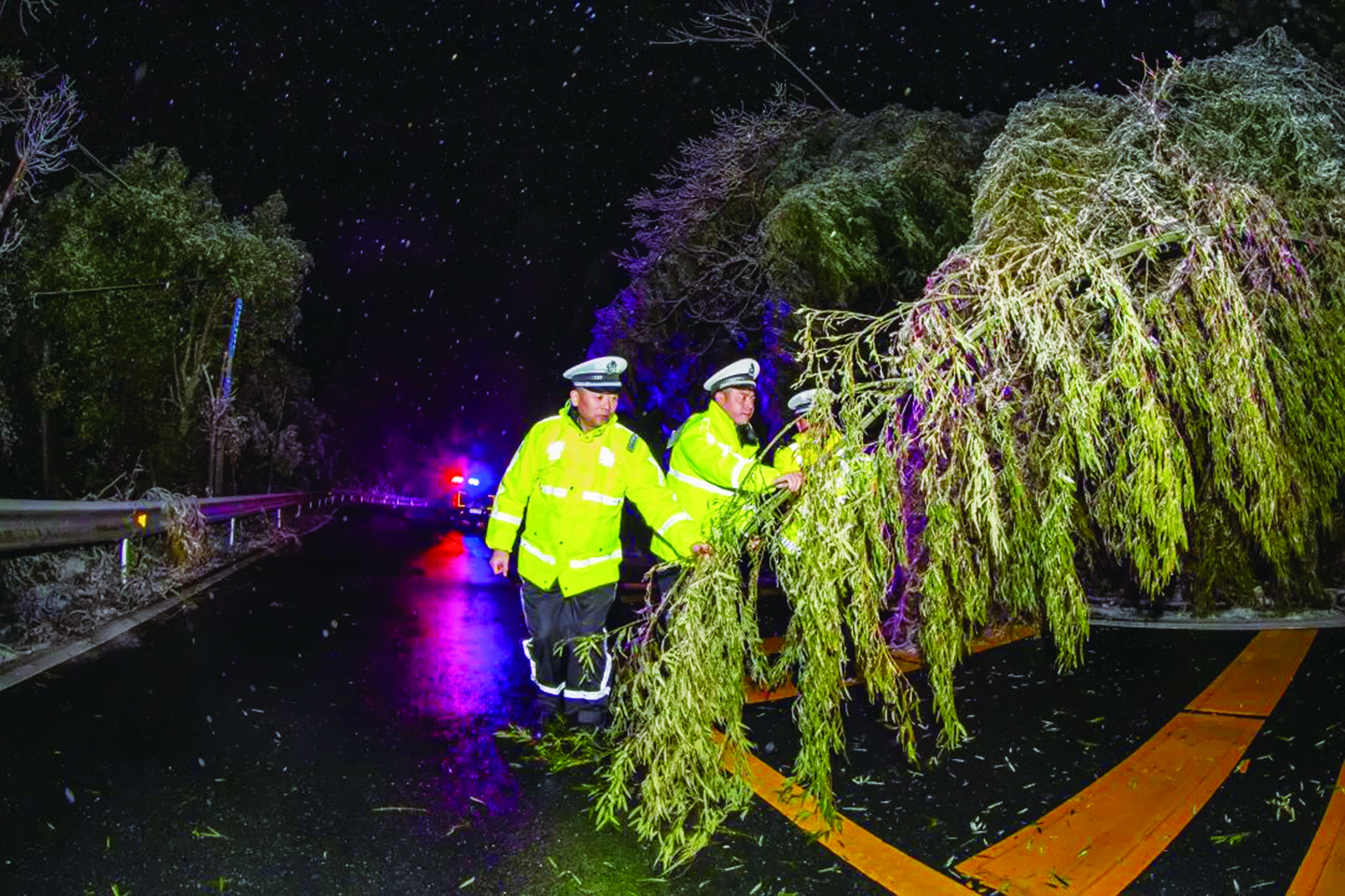 炎陵交警及时清理因积雪引发的路障。 受访部门 供图