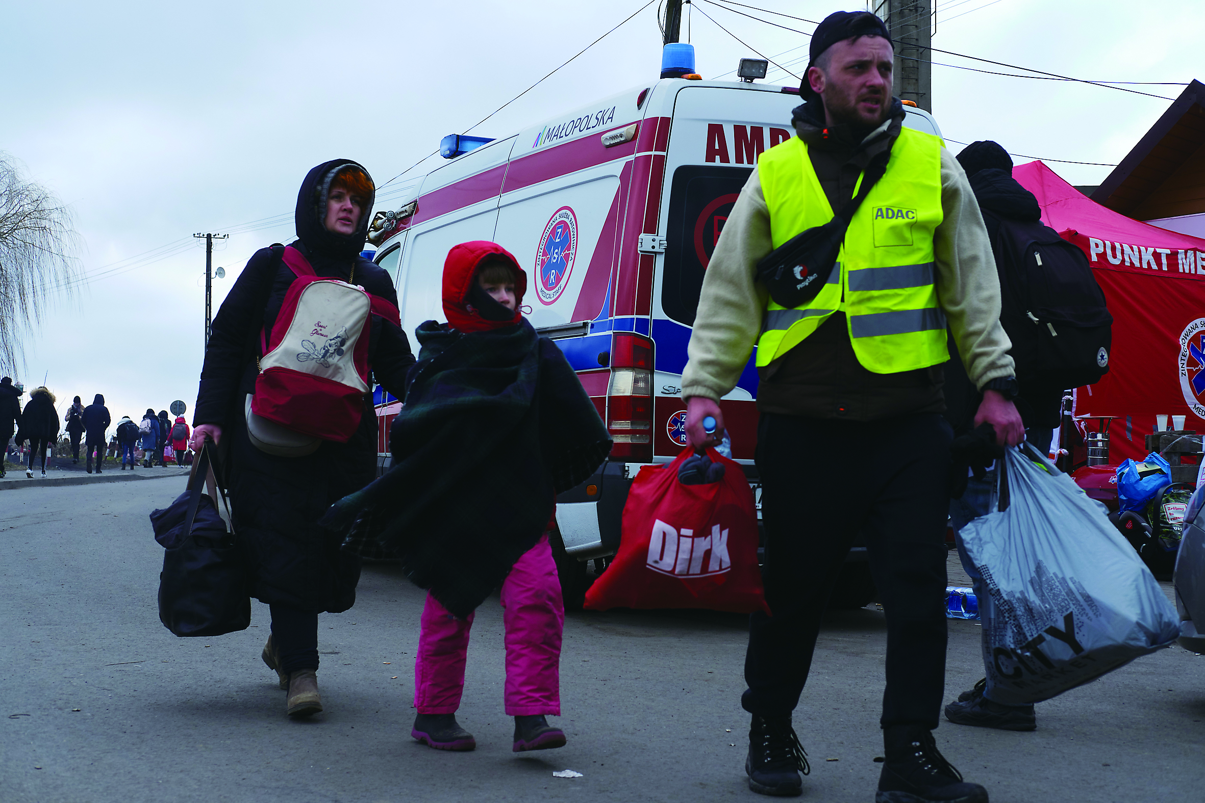 当地时间2月28日,一名志愿者陪同来自乌克兰的人们离开波兰梅迪卡口岸。新华社发