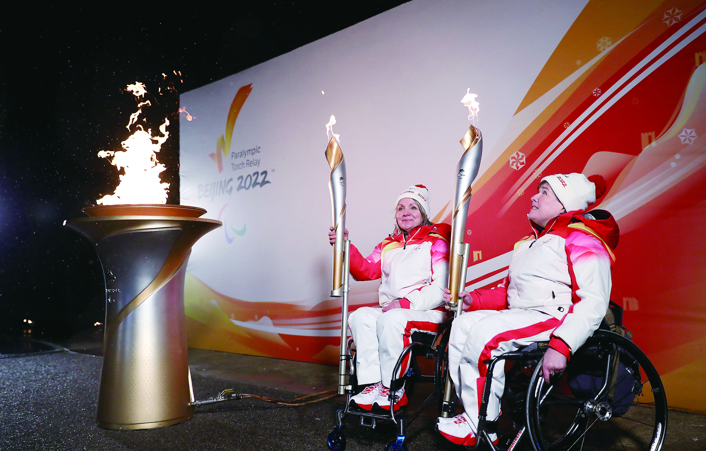 当地时间2月28日,火炬手、轮椅冰壶运动员尼尔森(右)和马隆在英国曼德维尔火种采集仪式上。 新华社发