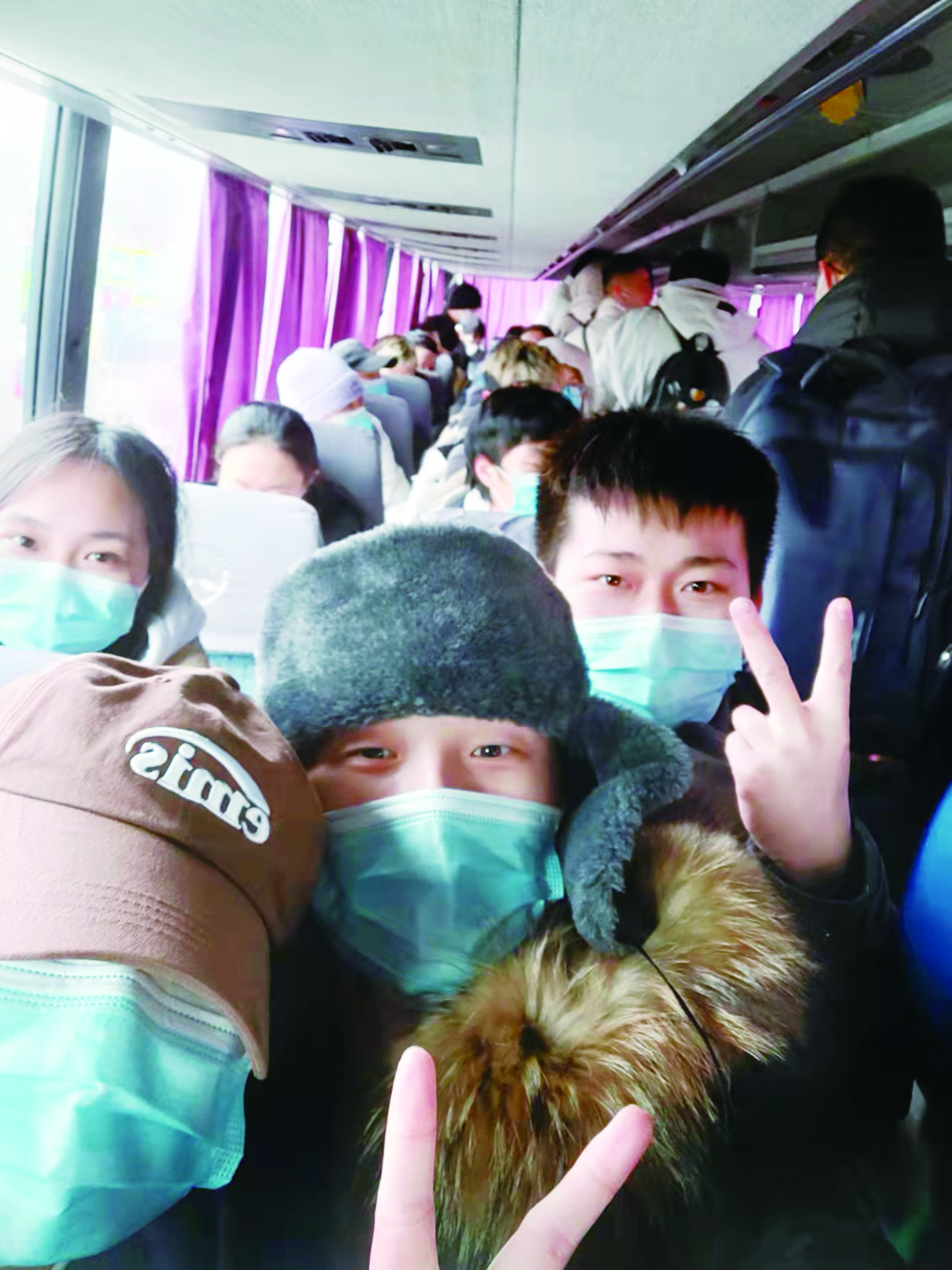小张(中间戴帽子者)和其他留学生一起登上前往匈牙利的大巴车。 受访者 供图
