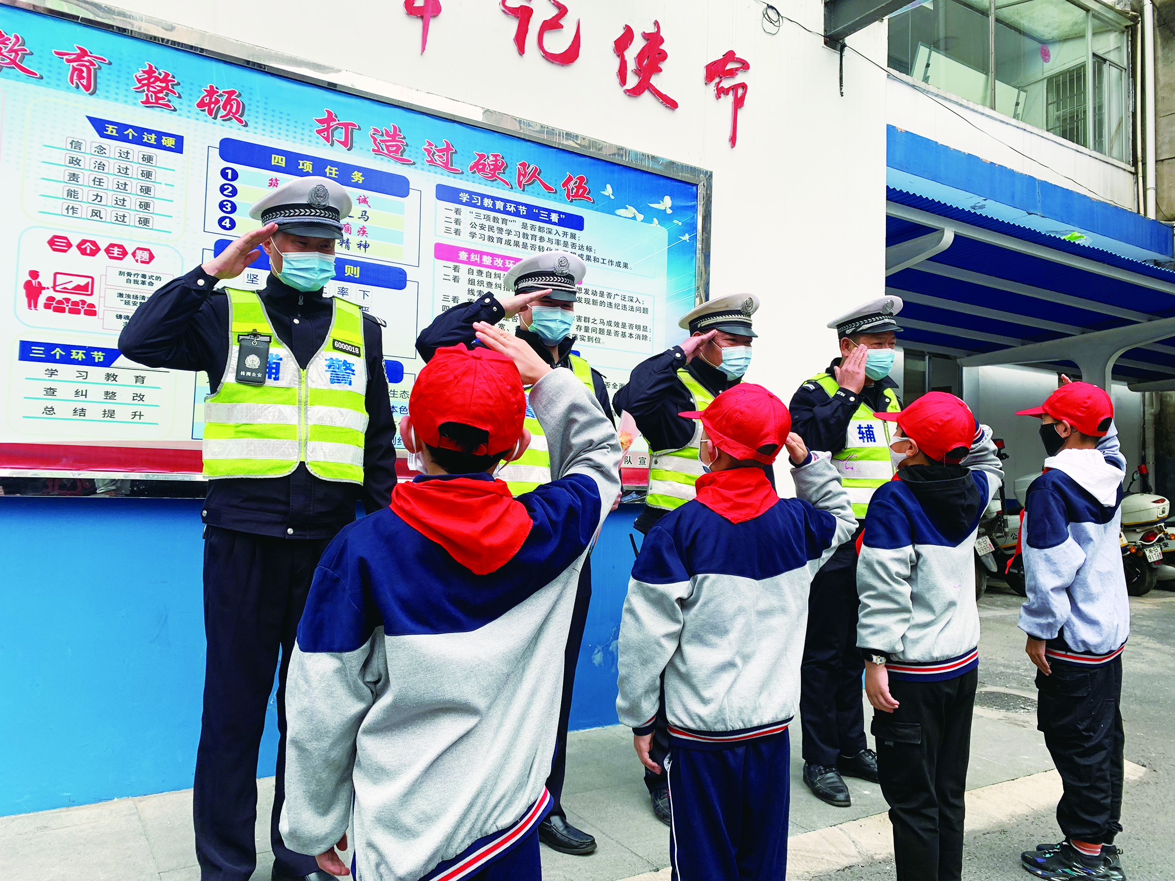 在大队院内,护学岗民辅警接受了孩子们送来的鲜花,孩子们向交警叔叔行少先队礼,交警敬礼回应。石峰交警大队一中队中队长黄继峰说:“我们履行平凡的职责,但孩子们视我们为身边的雷锋,让我们觉得非常温暖,我们会一如既往地守护好孩子们平安上下学,认真做好‘护花使者’。”