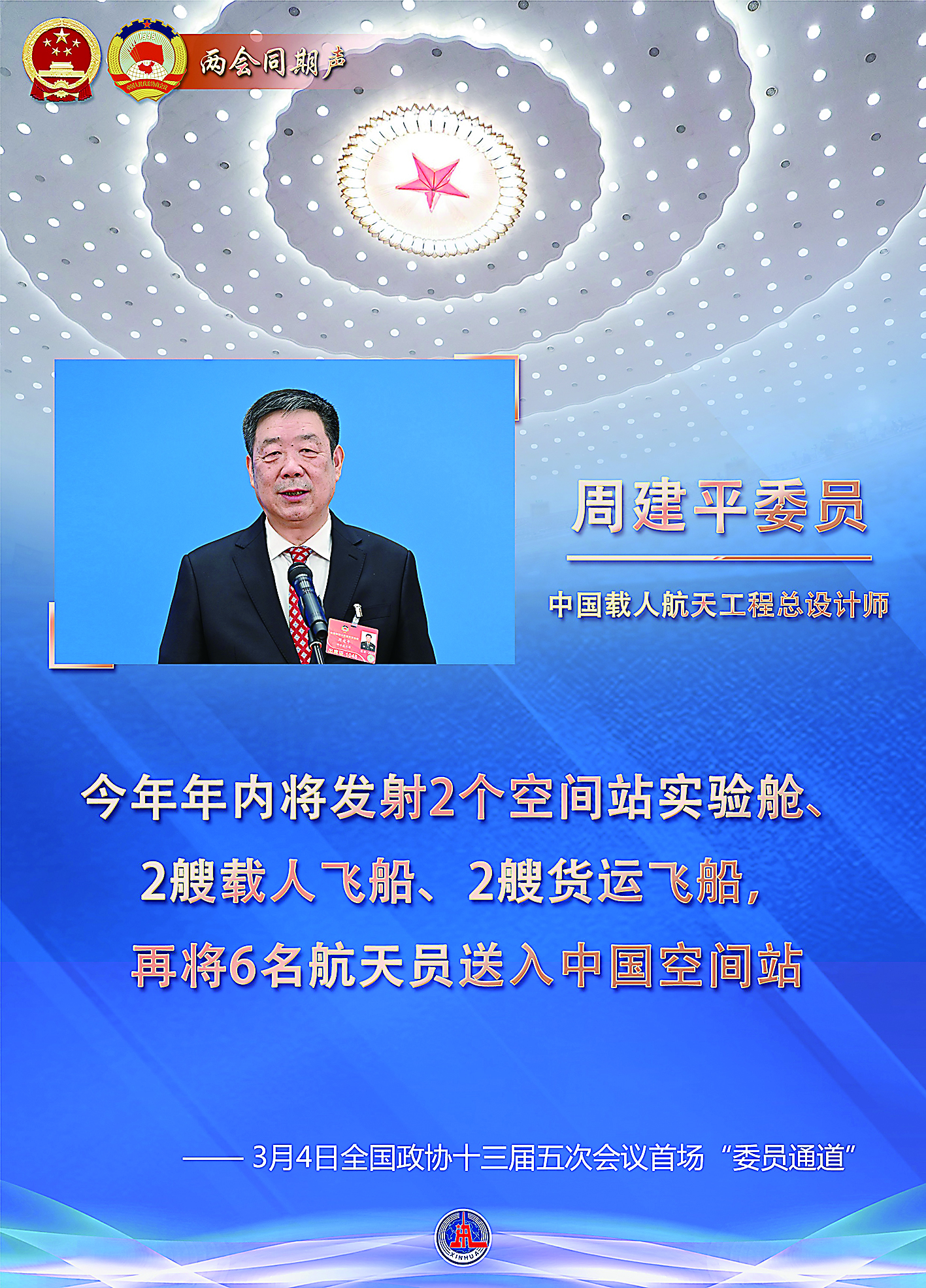 “从5月起,我国空间站工程将进入建造阶段。今年年内将发射2个空间站实验舱、2艘载人飞船、2艘货运飞船,再将6名航天员送入中国空间站。”周建平给出重磅“剧透”,这将首次实现6名航天员同时在轨。