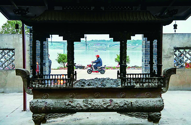 经过关帝庙前的骑车者。梁国柱 摄