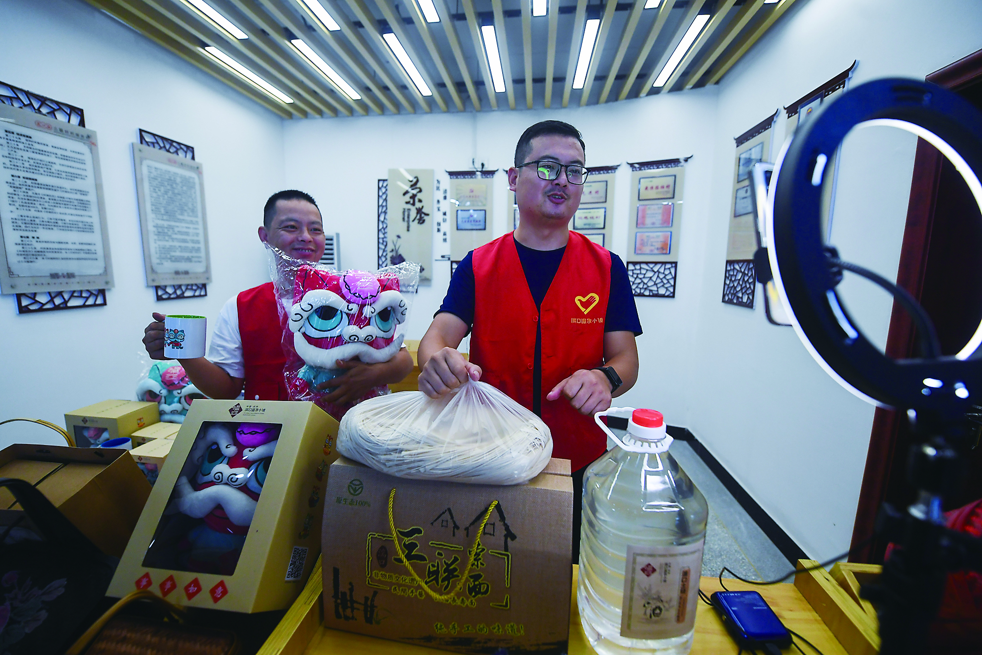 浙江省杭州市临安区湍口镇三联村党总支书记方刚(右)和党员志愿者在村里直播间展示当地特色农产品(2021年8月13日摄)。 新华社发