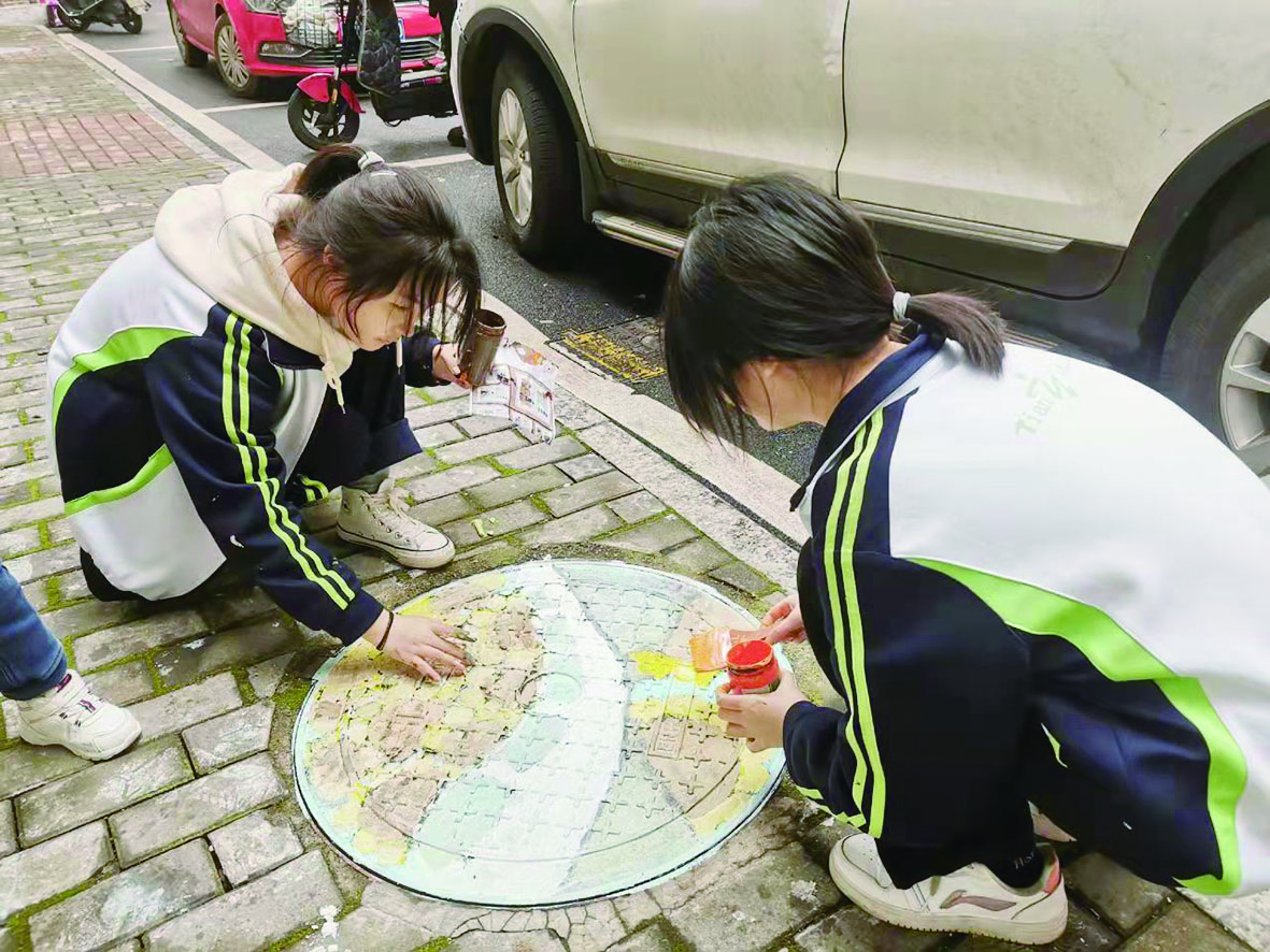 天元中学学生用手绘卡通画为下水道井盖“变身”。 株洲日报·掌上株洲记者/孙晓静 通讯员/彭元 摄
