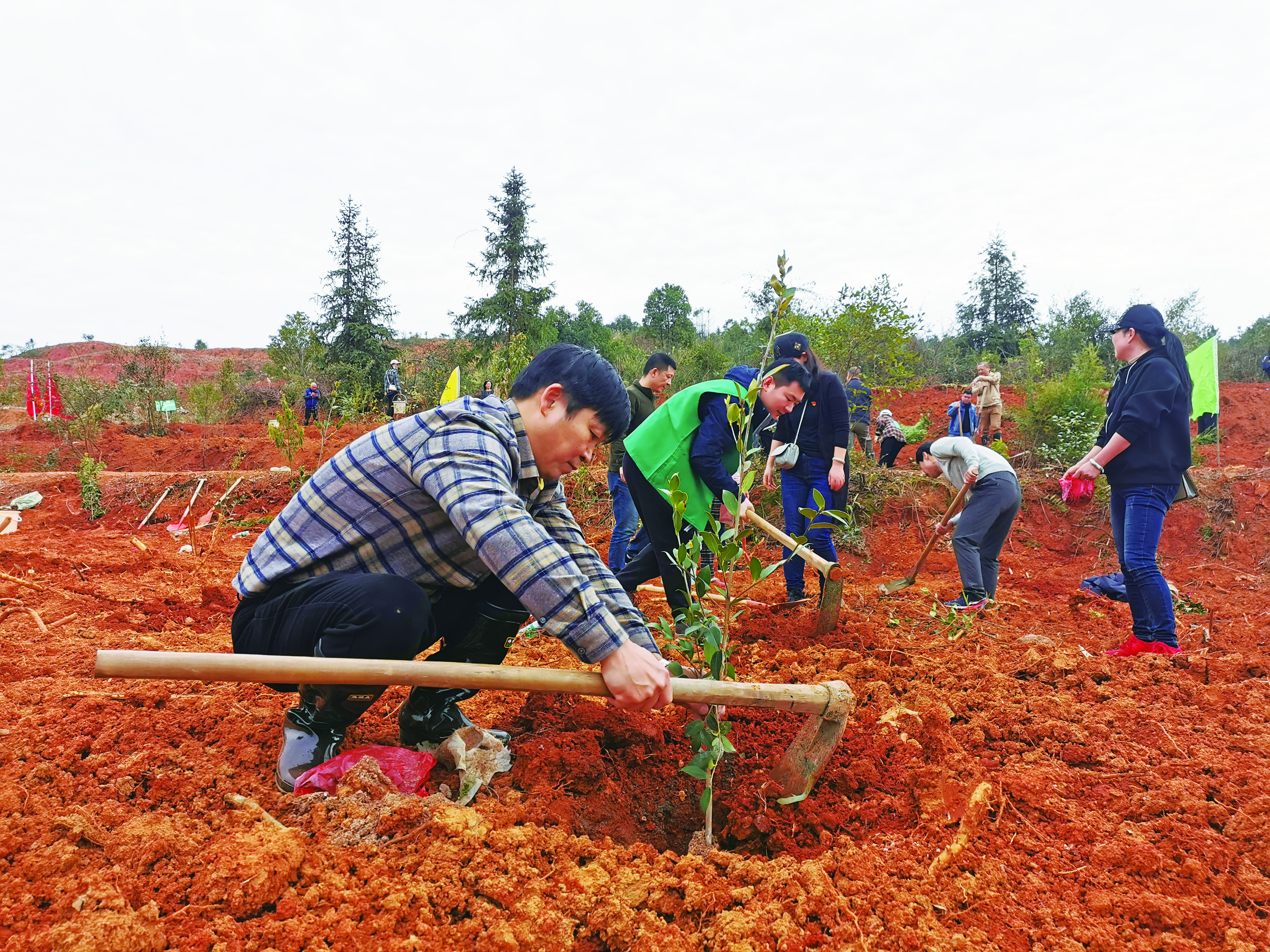 一大早,市水利局志愿者服务队就来了,大家两三人一组,挥锹铲土、扶植树苗、培实新土、提桶浇灌,每一个环节都细致入微。树苗栽下后,市水利局局长张智敏还不忘在苗木周边开挖一道小坑,“方便储水,让苗木更好地吸收雨露。”他扶正幼小的油茶苗,均匀挥舞着锄头。