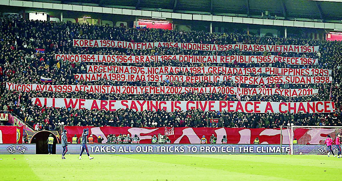 新华社贝尔格莱德3月18日电 在塞尔维亚首都贝尔格莱德17日举行的一场足球比赛中,塞尔维亚观众拉起多条横幅,细数美国、北约过去几十年来轰炸或挑起战争的国家和地区名单,并高唱反战歌曲,以此讽刺西方在“反战”方面的双重标准。