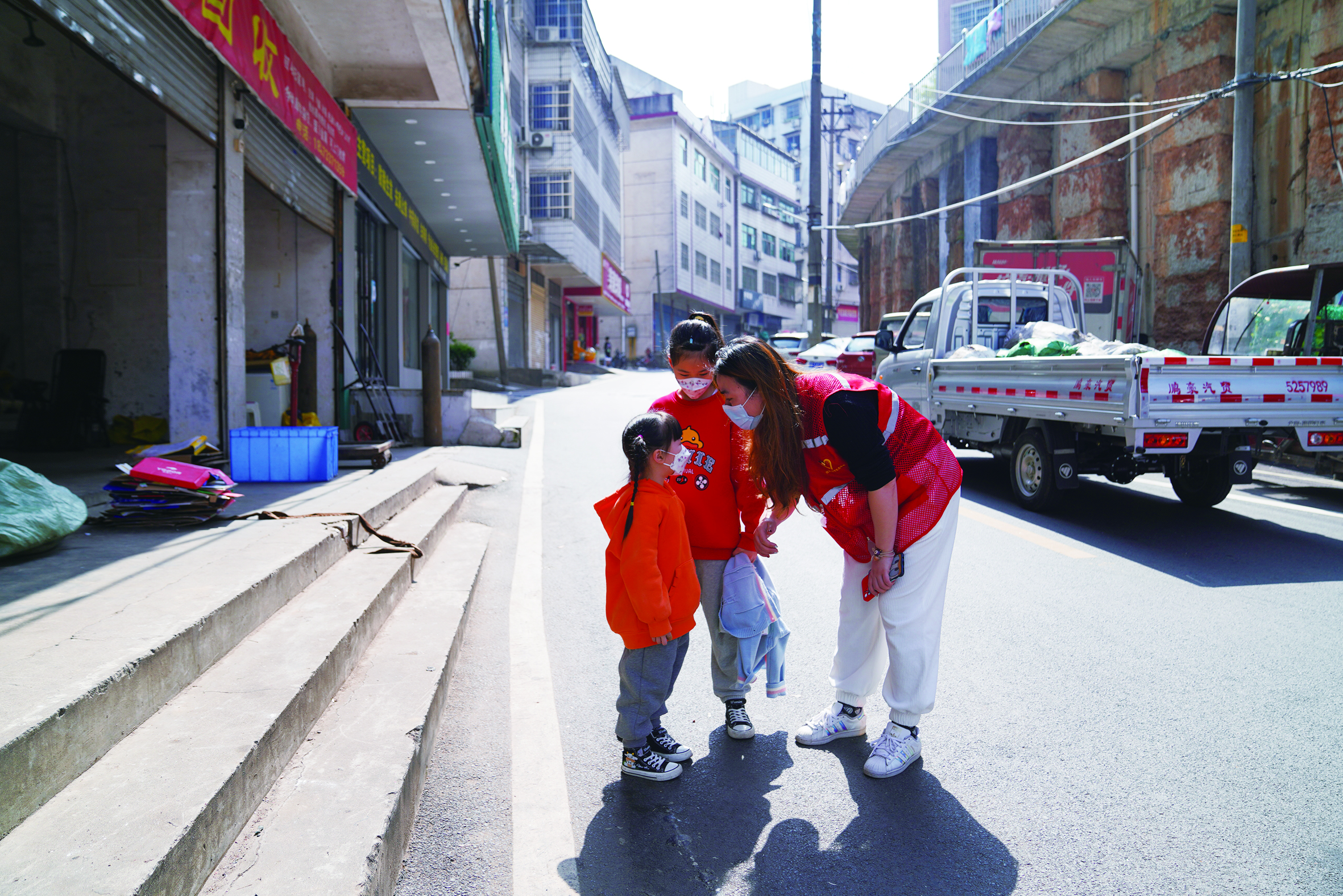 原来,孩子们的妈妈是刘媚妮,此时她正与疫情特派员们一起巡逻,提示外出市民佩戴口罩。与其他工作人员一样,她已连续在疫情防控一线工作多日。