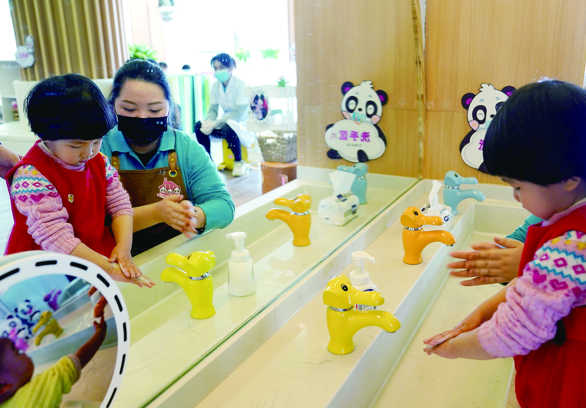 近日,上海市静安区江宁路街道的首批两家“宝宝屋”分别在社区党群服务中心和综合为老服务中心开始试运营。这是静安区教育局与江宁路街道合作试点的首批公益普惠的社区“宝宝屋”,为有幼儿的家庭提供临时性、计时制的集中照护和育儿指导服务,缓解临时性托育难题。图为“宝宝屋”的看护人员教小朋友洗手。 新华社发