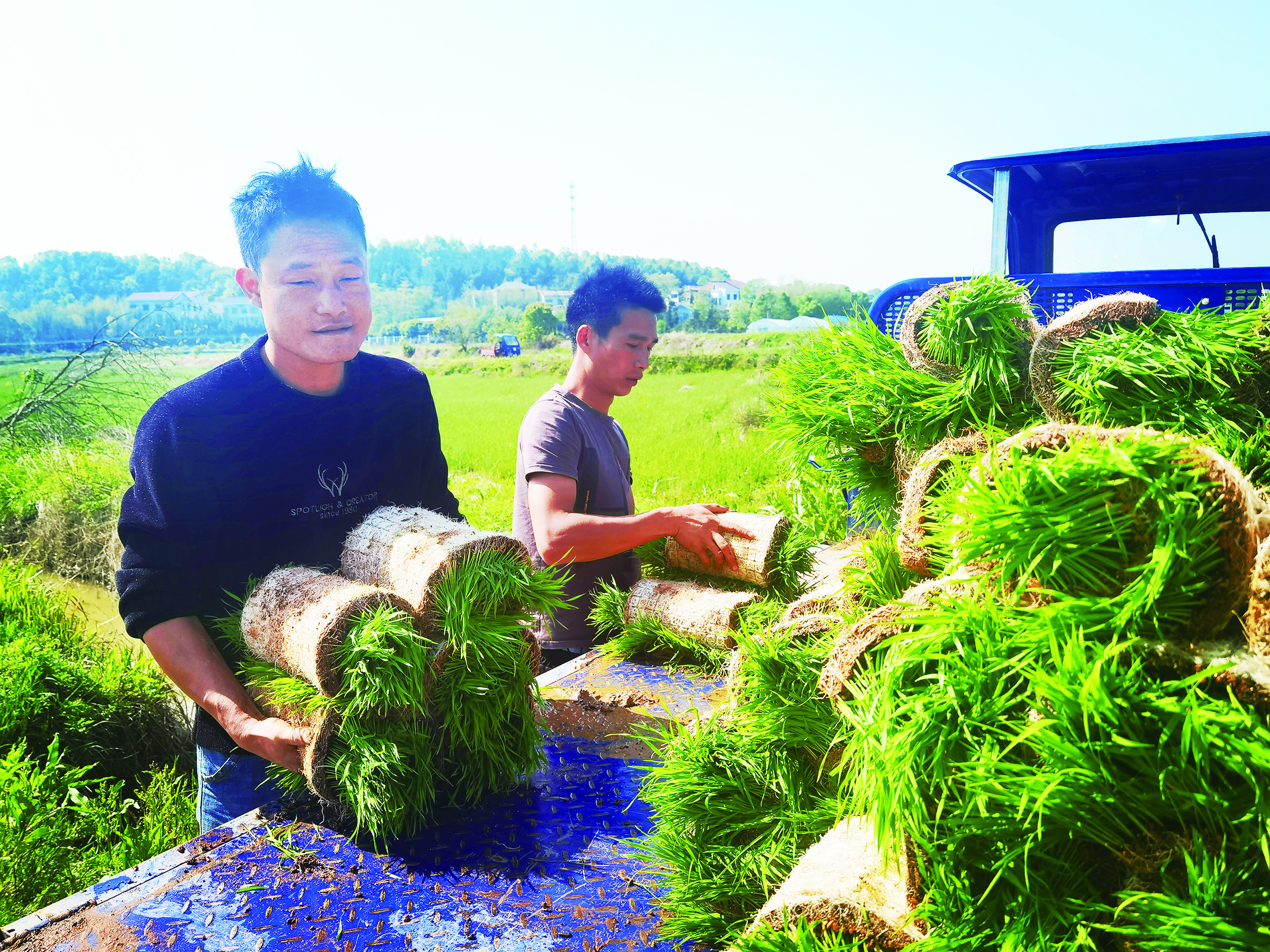 一阵急促的轰鸣声响起,“喘着”粗气的三轮车经过机耕道,稳稳停在水田边。车上,一捆捆翠绿的秧苗码得整整齐齐,叶片上淌着露珠。