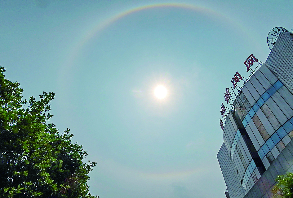 4月18日下午,在天元区黄河路上空,太阳周围出现了一圈漂亮彩环,像被圆形彩虹拥抱着。据介绍,日晕也叫圆虹,是日光通过云层中的冰晶时,受到冰晶的折射或反射而形成的一种大气光学现象,多出现于春夏季节。