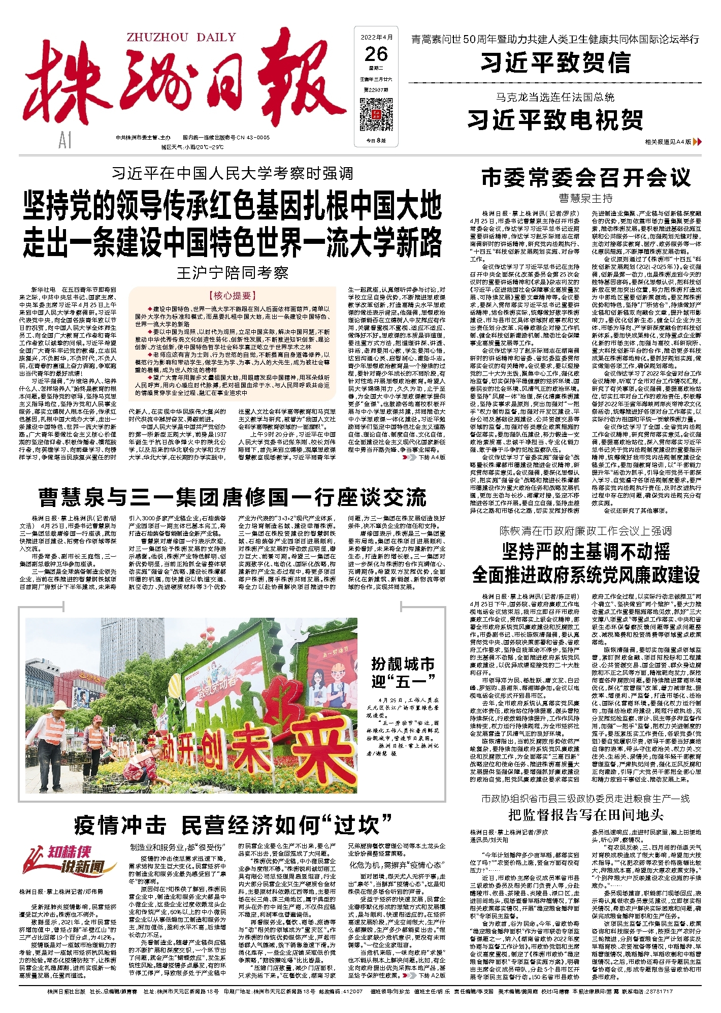 新华社电 在五四青年节即将到来之际,中共中央总书记、国家主席、中央军委主席习近平4月25日上午来到中国人民大学考察调研。习近平代表党中央,向全国各族青年致以节日的祝贺,向中国人民大学全体师生员工、向全国广大教育工作者和青年工作者致以诚挚的问候。习近平希望全国广大青年牢记党的教诲,立志民族复兴,不负韶华,不负时代,不负人民,在青春的赛道上奋力奔跑,争取跑出当代青年的最好成绩!