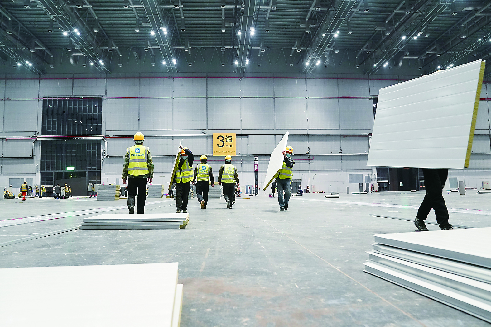为应对当前新冠肺炎疫情,上海正将国家会展中心(上海)改建成又一座方舱医院,建成后有望提供4万张床位。国家会展中心(上海)共有八个展馆。目前,多家承建方已进驻,将根据各个展馆条件,在展馆内搭建一层或二层的方舱。国家会展中心(上海)因其结构外表而被称为“四叶草”。图为4月5日,工人在国家会展中心(上海)内作业。 新华社发
