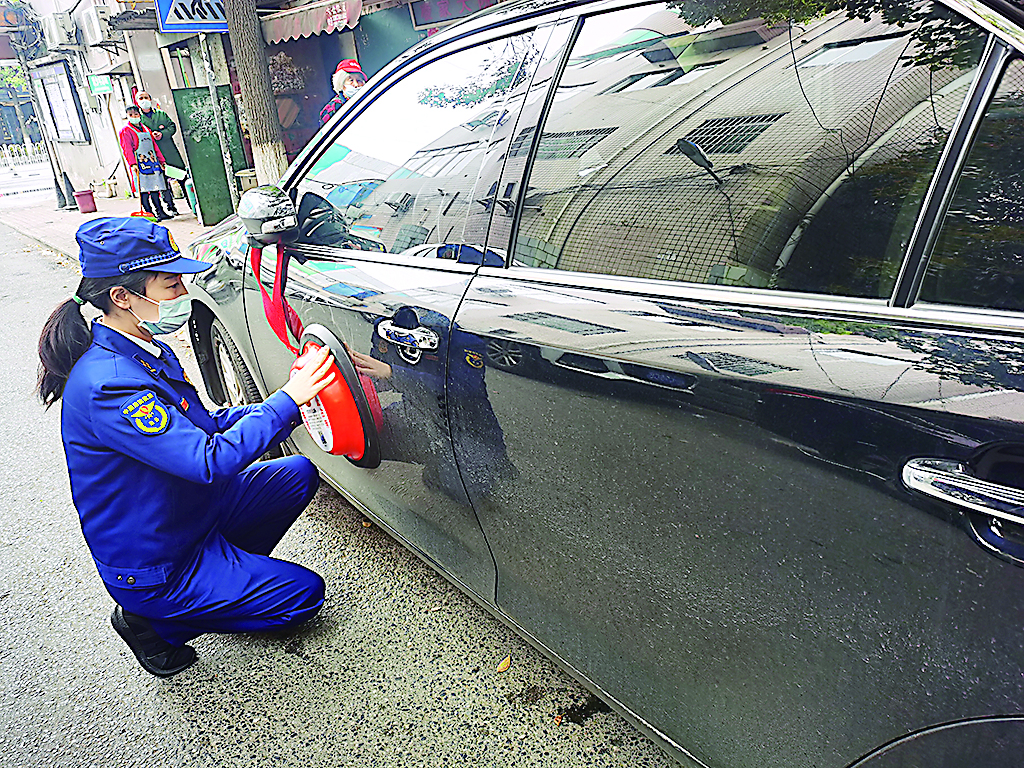 消防监督员对违停车辆盖上电子告知单。 株洲日报·掌上株洲记者/马文章 摄