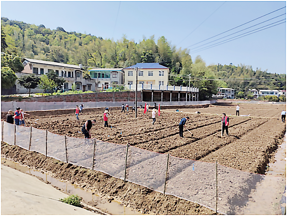 ◀抢抓农时,兴塘村干部群众下地齐种丝瓜。 通讯员供图