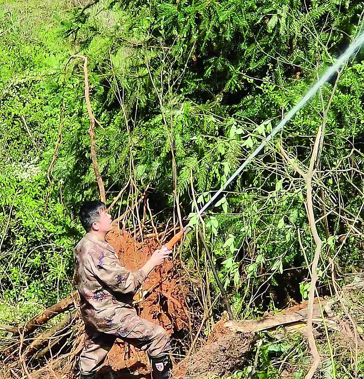 为提高防灾救灾和处置各类突发事件应急保障能力,雷打石镇成立了一支由10多名党员退伍军人组建的应急处突队,他们驻扎乡镇,24小时待命,遇到紧急情况,10分钟内集合完毕;他们巡逻执勤,抢险救灾,维护社会治安……哪里有险情和困难,哪里就闪动着他们的身影。“我们的队员,通过日常的训练、学习和实战,再结合雷打石镇地理因素,总结出一套适用农村应急处突的方法,召之即来,来之能战。”应急处突队队长苏强介绍说。图为雷打石镇应急处突队队员在灭火。