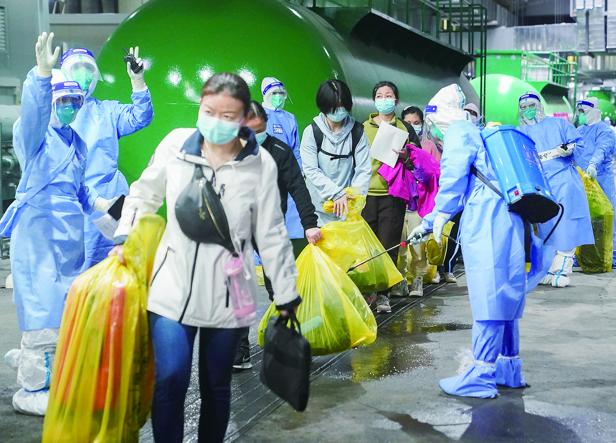4月14日,在国家会展中心(上海)方舱医院,首批患者出舱。新华社记者 丁汀 摄