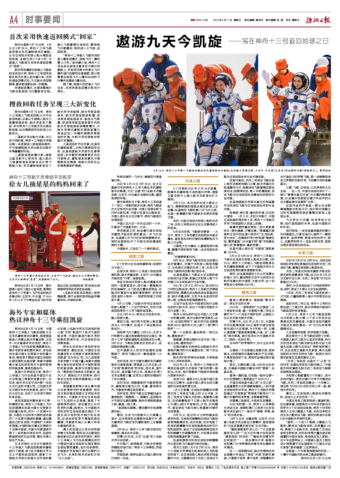新华社北京4月16日电 中国神舟十三号载人飞船返回舱16日在东风着陆场成功着陆,现场医监医保人员确认航天员翟志刚、王亚平、叶光富身体状态良好,神舟十三号载人飞行任务取得圆满成功。海外专家学者和媒体表示,该任务成功是中国太空探索计划的重大胜利,将有助于推进中国空间站的长期发展和全面运营,希望中国能够分享在科研和技术方面所取得的突破进展,继续加强合作。