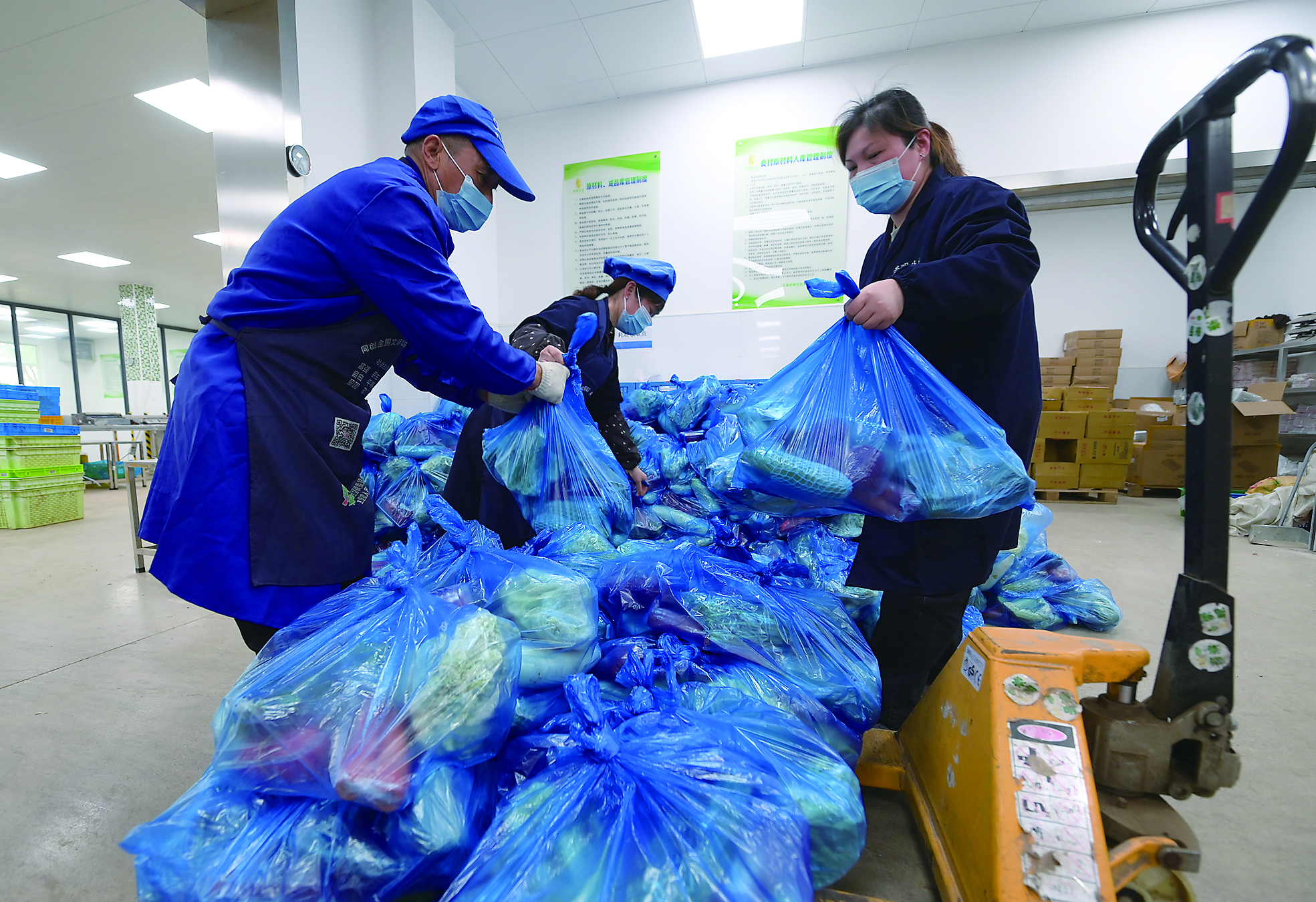 连日来,上海市崇明区各蔬菜生产、加工企业积极组织人力物力,提升蔬菜供应能力,助力疫情防控。4月19日上海崇明生态农业发展有限公司的工作人员在装运打包好的蔬菜,准备运往市区。 新华社发