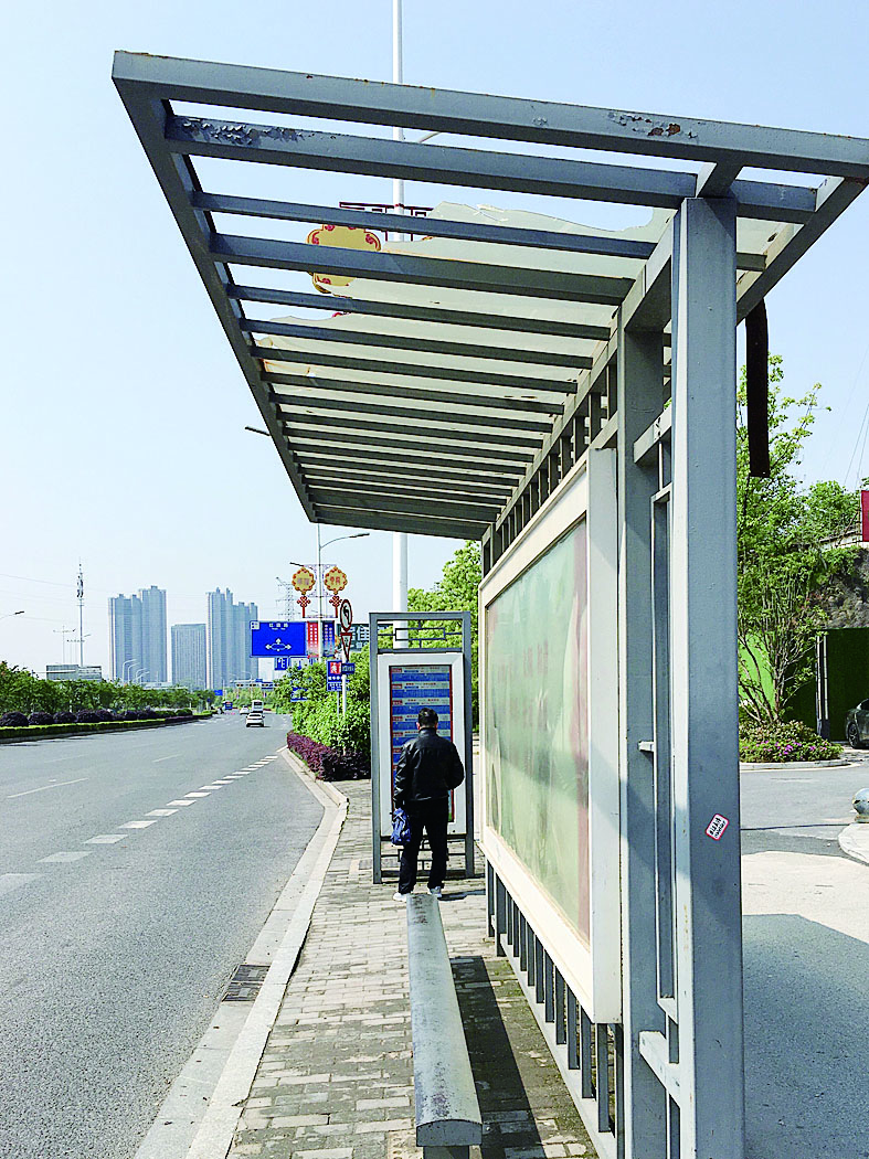 云龙大道边,部分公交车站候车棚顶部破损,出现窟窿。 株洲日报·掌上株洲记者/刘平 摄