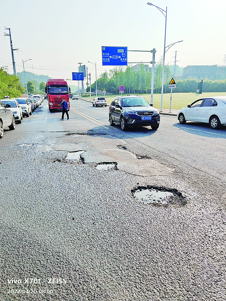 4月20日早上,记者在芦淞区伟大路上看到,从枫溪大道往青龙湾小镇方向长约300米的道路上,大小坑洞密布,不但让过往车辆通行不便,也存在安全隐患。此外,记者发现,在伟大路北侧的人行道上,密密麻麻停满了车辆。