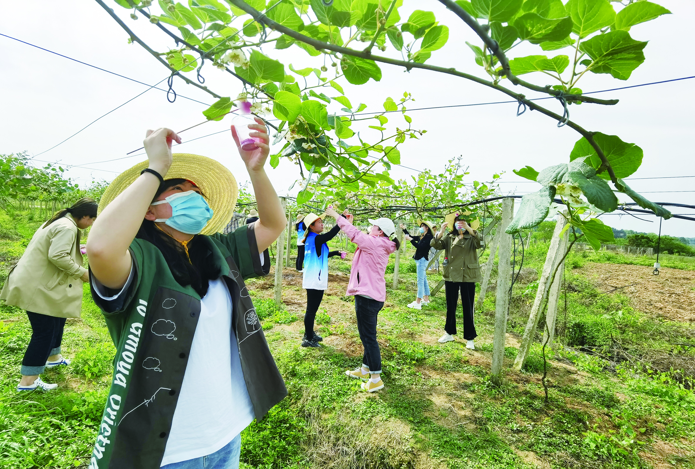 三门镇猕猴桃基地,10余名年轻干部前来帮忙授粉。 株洲日报·掌上株洲记者/杨如 通讯员/刘星 宋洁 摄