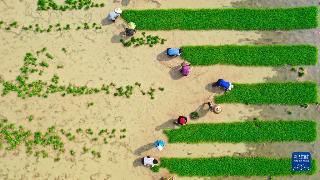 4月24日,在湖南省常宁市宜阳街道万寿村,村民在秧田里起秧苗(无人机照片)。