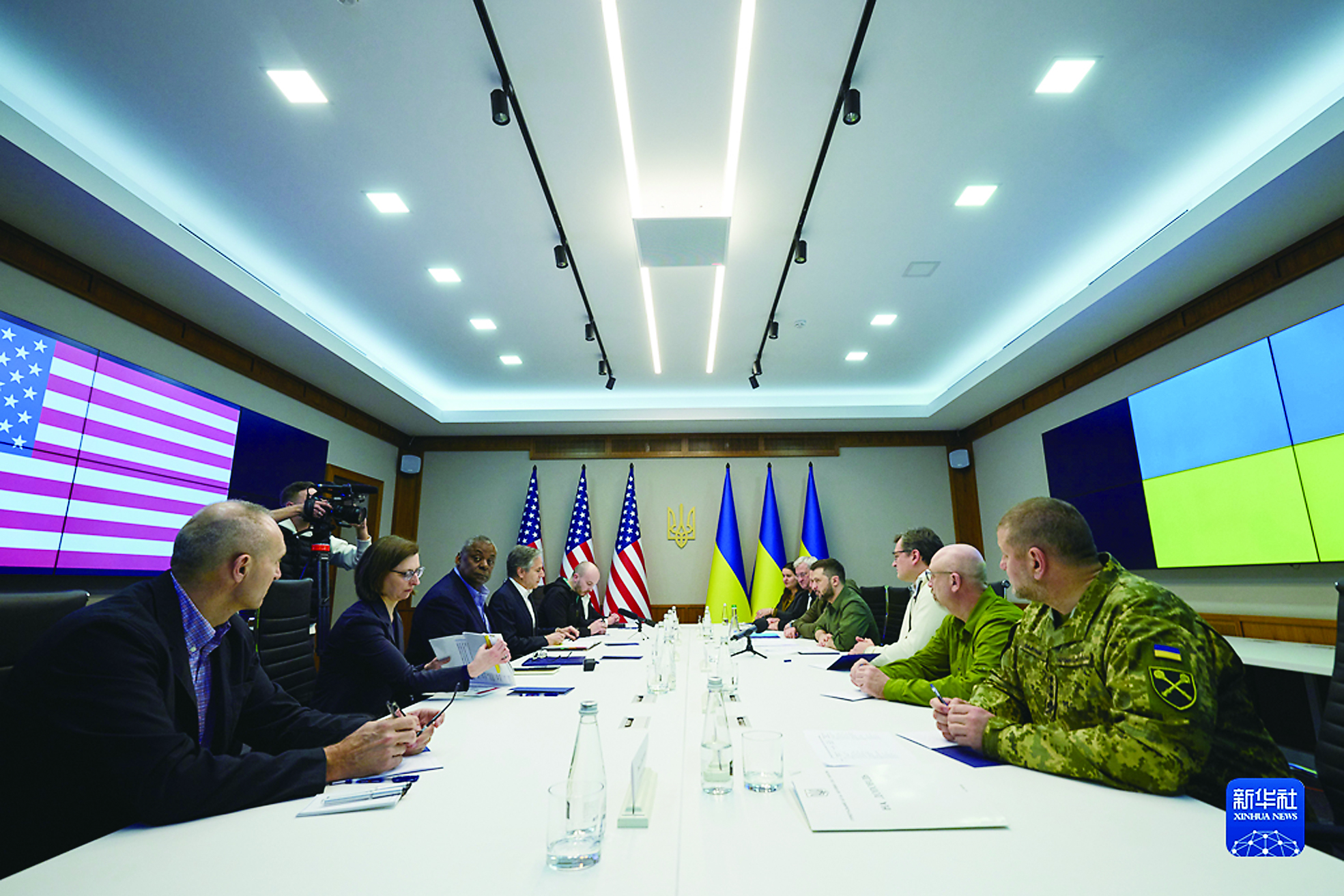 当地时间4月24日,乌克兰总统泽连斯基(右四)在基辅会见美国国务卿布林肯(左四)和国防部长奥斯汀(左三)。