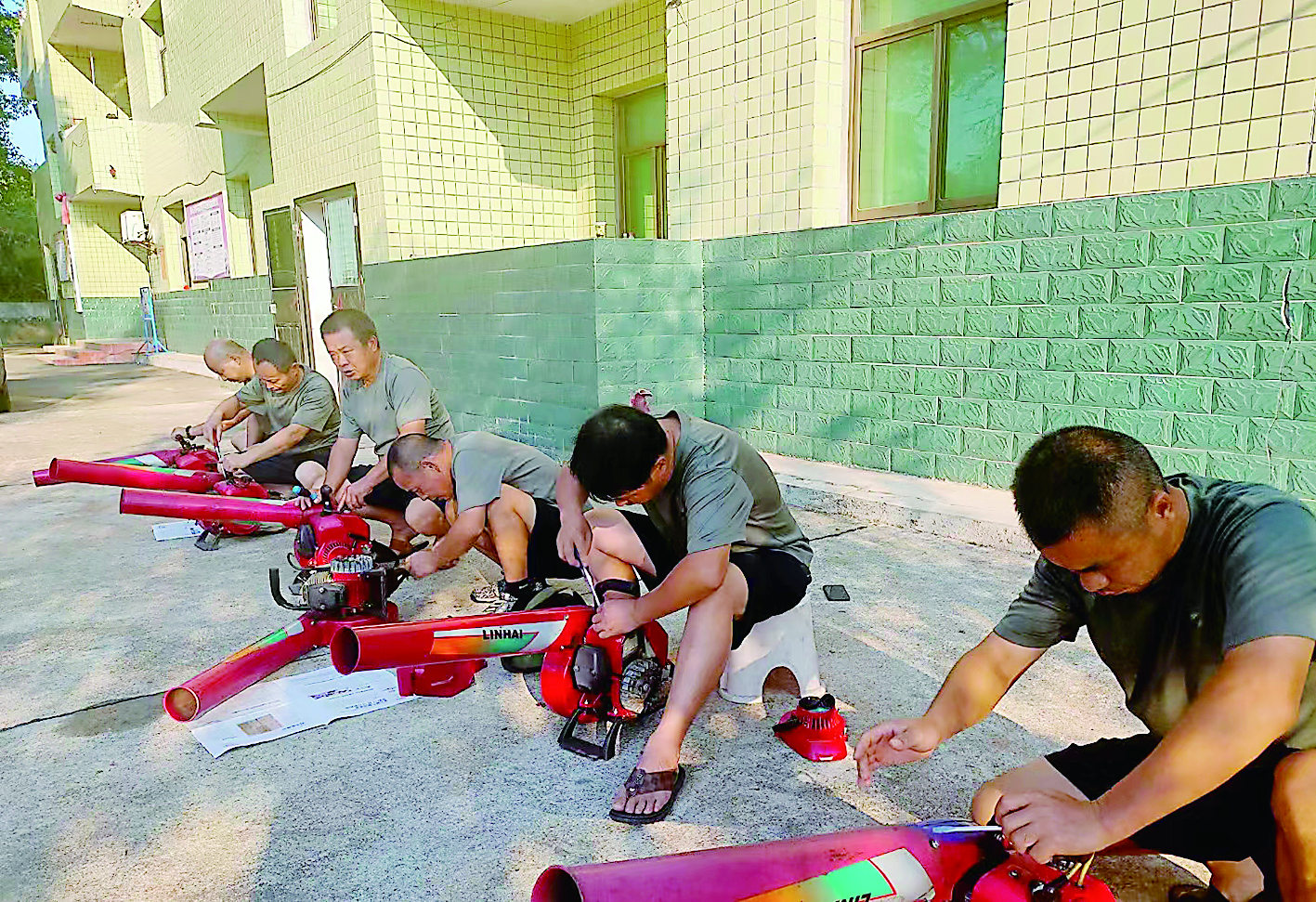 迅速起身换上迷彩服,戴上水壶和镰刀,将灭火风力机装上车……4月26日一大早,攸县森林消防队队长杨远鹏在几分钟内集结队员,准备当天的操练。