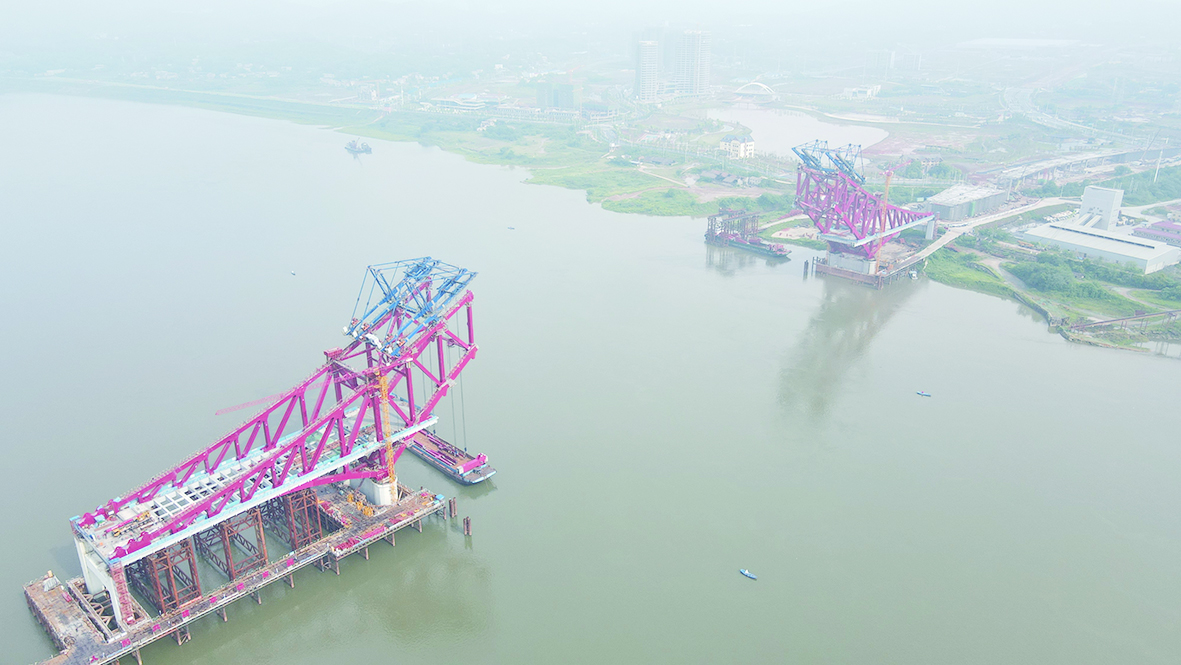 视野转向清霞路3期不远处的清水塘大桥。吊车在空中来回摆渡,航船在江中穿梭,工作现场一片繁忙。大桥的桩基础、承台、墩柱施工已经完成全部,工人正在进行主桥上部钢结构安装和引桥现浇箱梁施工……