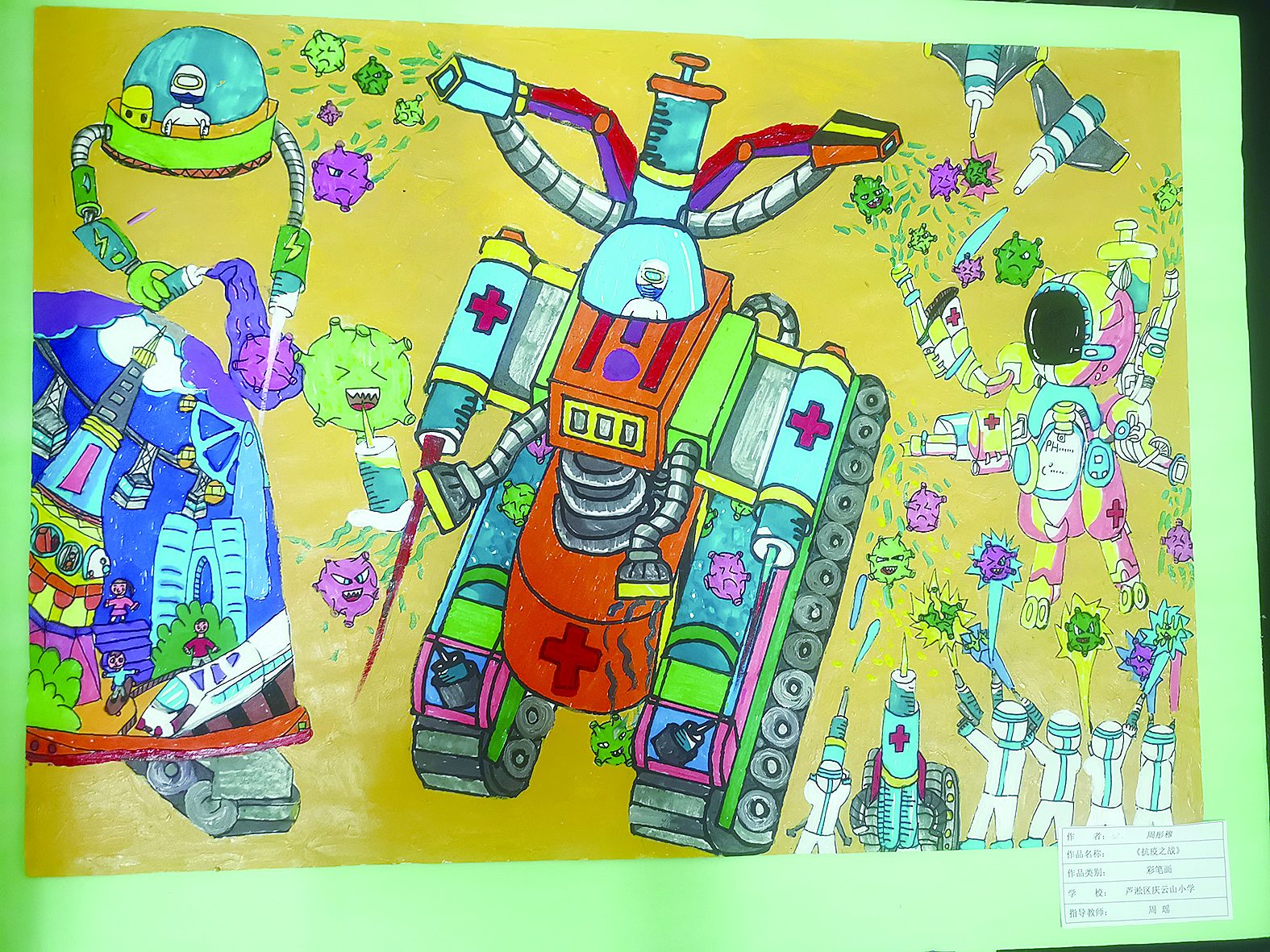 未来城中,机器人给孩子们接种疫苗、研制成功的新冠疫苗抵御住病毒的侵袭、孩子们有序排队接种国家免疫规划疫苗……25日,记者在庆云山小学看到,疾控专家在健康讲座中讲解疫苗接种的重要性、安全性以及注意事项等;孩子们则用天马行空的想象力、五颜六色的画笔抒发心中关于“疫苗伴我健康成长”的所思所想。