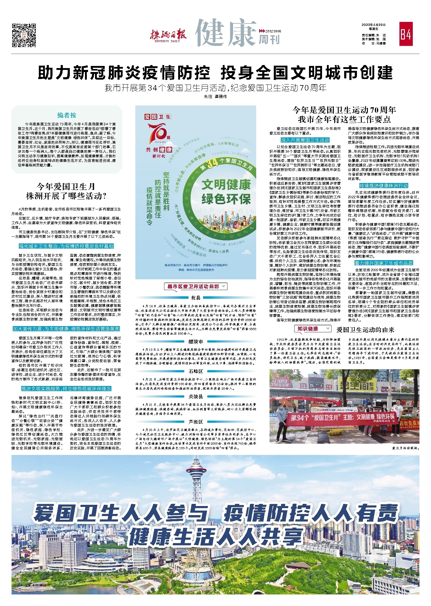 以纪念爱国卫生运动70周年为主题,组织开展第34个爱国卫生月等活动。认真组织开展迎“五一”“国庆”等重大节庆期间爱国卫生周活动,围绕“世界卫生日”“世界无烟日”“世界环保日”“世界厕所日”等主题活动日,普及疾病预防知识,倡导文明健康、绿色环保生活方式。