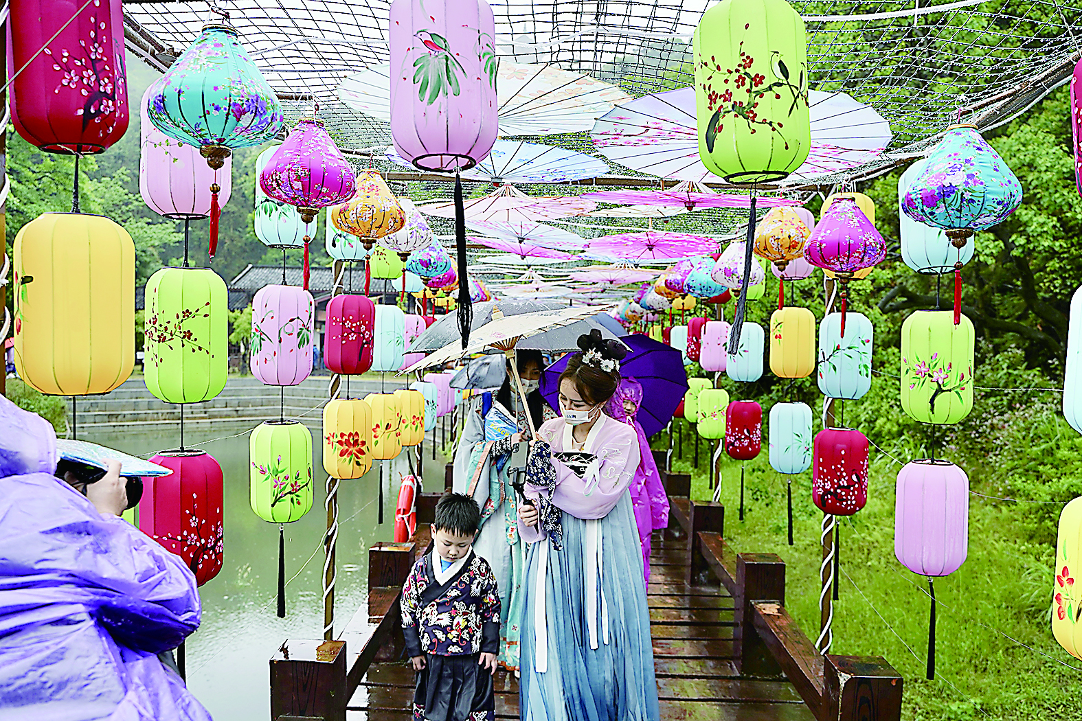 图为游客参加酒仙湖油桐花节开幕式游园活动。