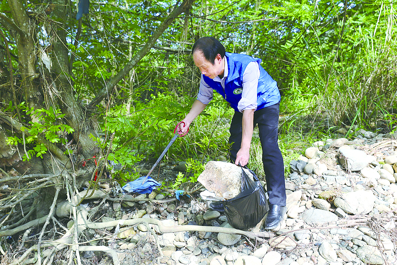 周新文在洣水沿岸清理垃圾。 受访者供图