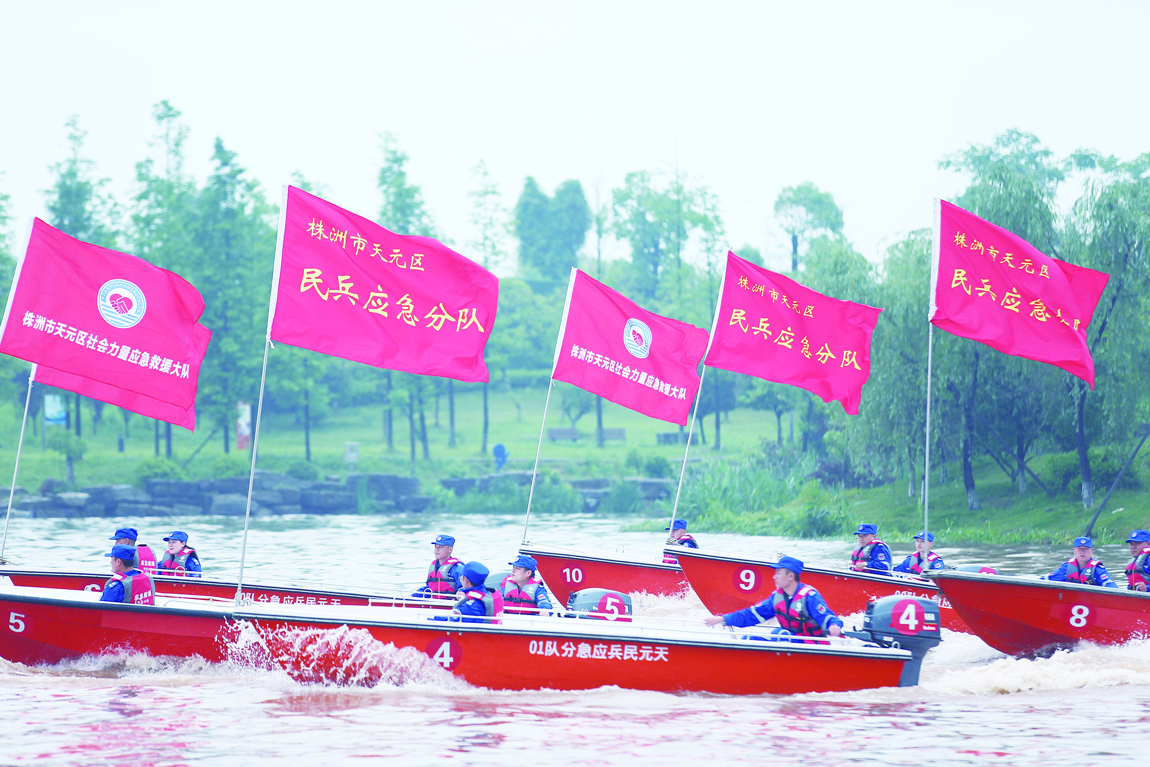 5月9日,株洲市2022年军地联合抗洪抢险综合演练暨基干民兵集中点验大会举行,来自全市40余支民兵应急队伍,用实战化状态检验应急救援人员抗洪抢险应急能力。当前,我市进入主汛期,本次演练以湘江流域一带持续出现特大暴雨,沿线群众生命财产受到威胁为背景,采取移动模拟的方式进行演练。图为演练现场。