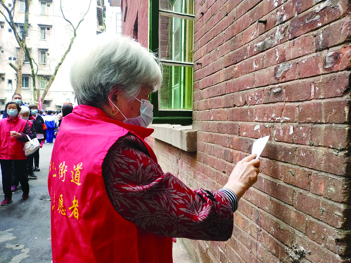 4月29日下午,在贺家土洗煤小区和嘉园小区,几乎每个楼栋里都有穿着红马甲的老人和穿着校服的学生志愿者穿梭。他们手里拿着小铲子、一次性水杯、钢丝球等工具,三五成群,分工合作,清理墙面、地面小广告。