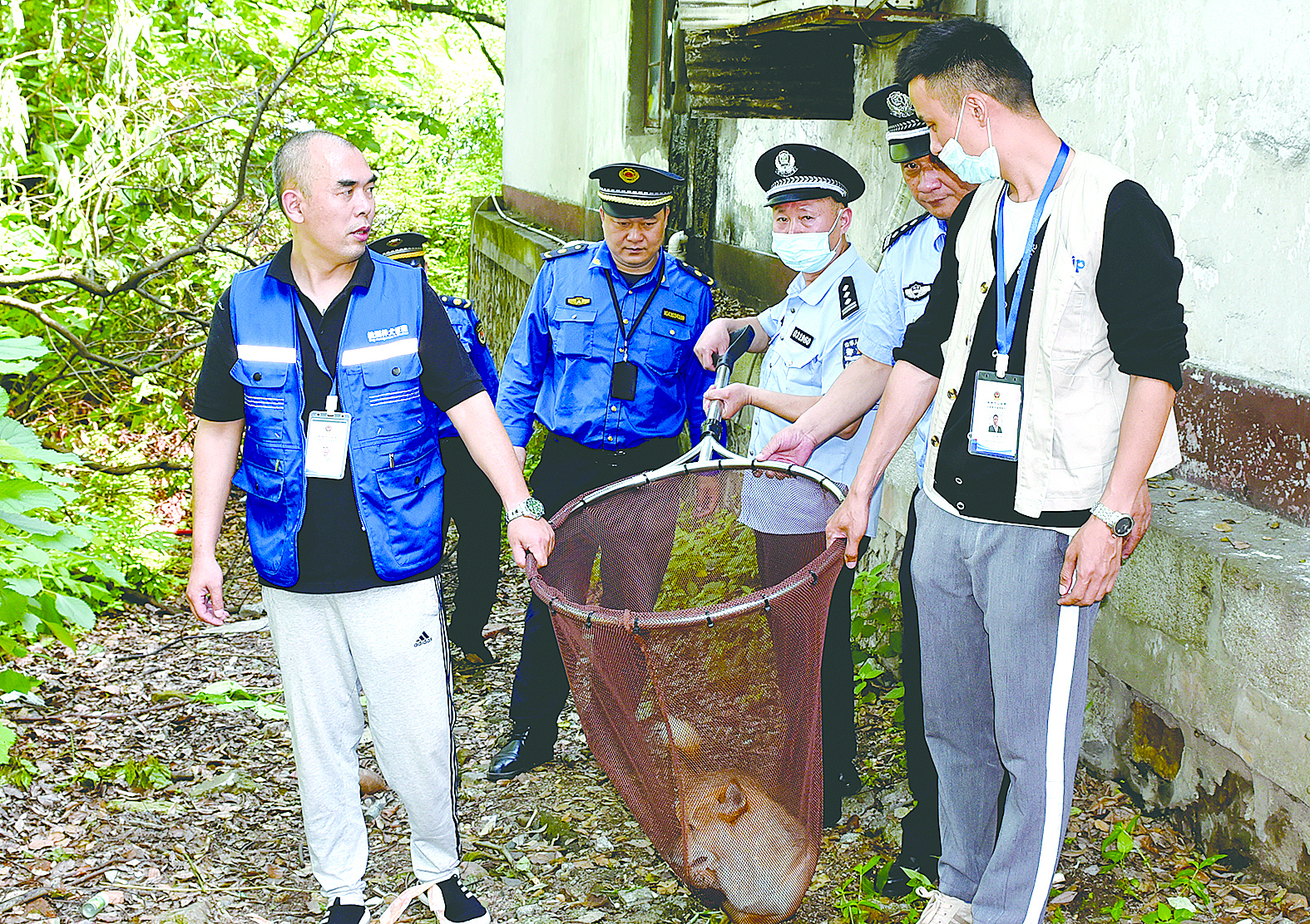 公安、城管联合捕获流浪狗。
