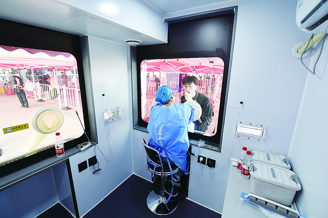 5月7日,工作人员在位于合肥南站的移动式核酸采样工作站里对出站旅客进行核酸采样。
