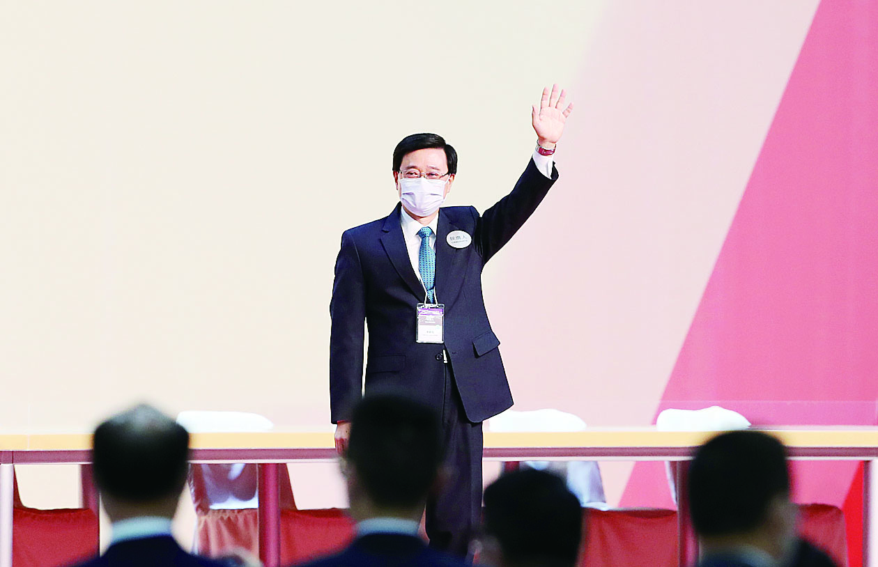 5月8日,在香港会议展览中心,李家超挥手致意。新华社记者 李钢 摄