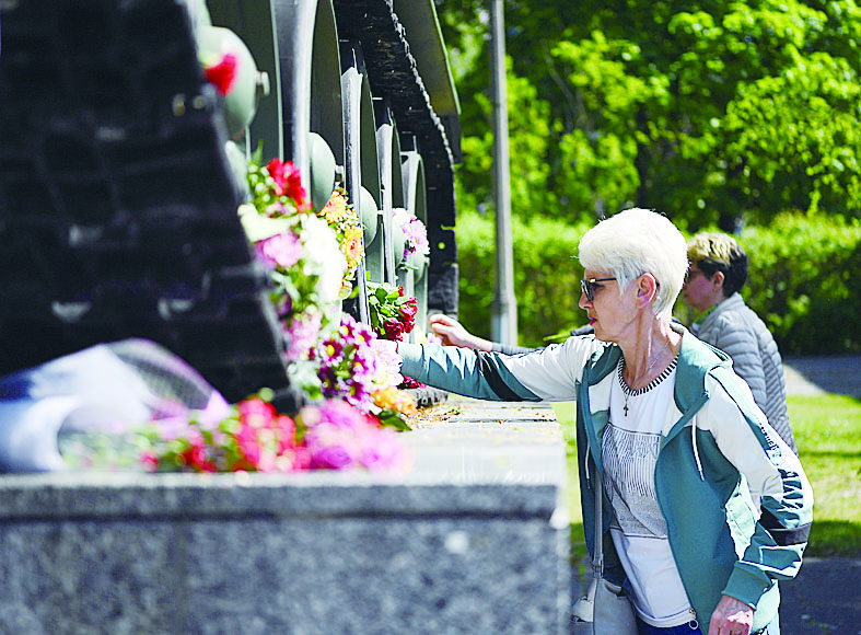 5月8日,在德国首都柏林的德俄博物馆,一名女子在一辆用于展览的坦克旁献花。
