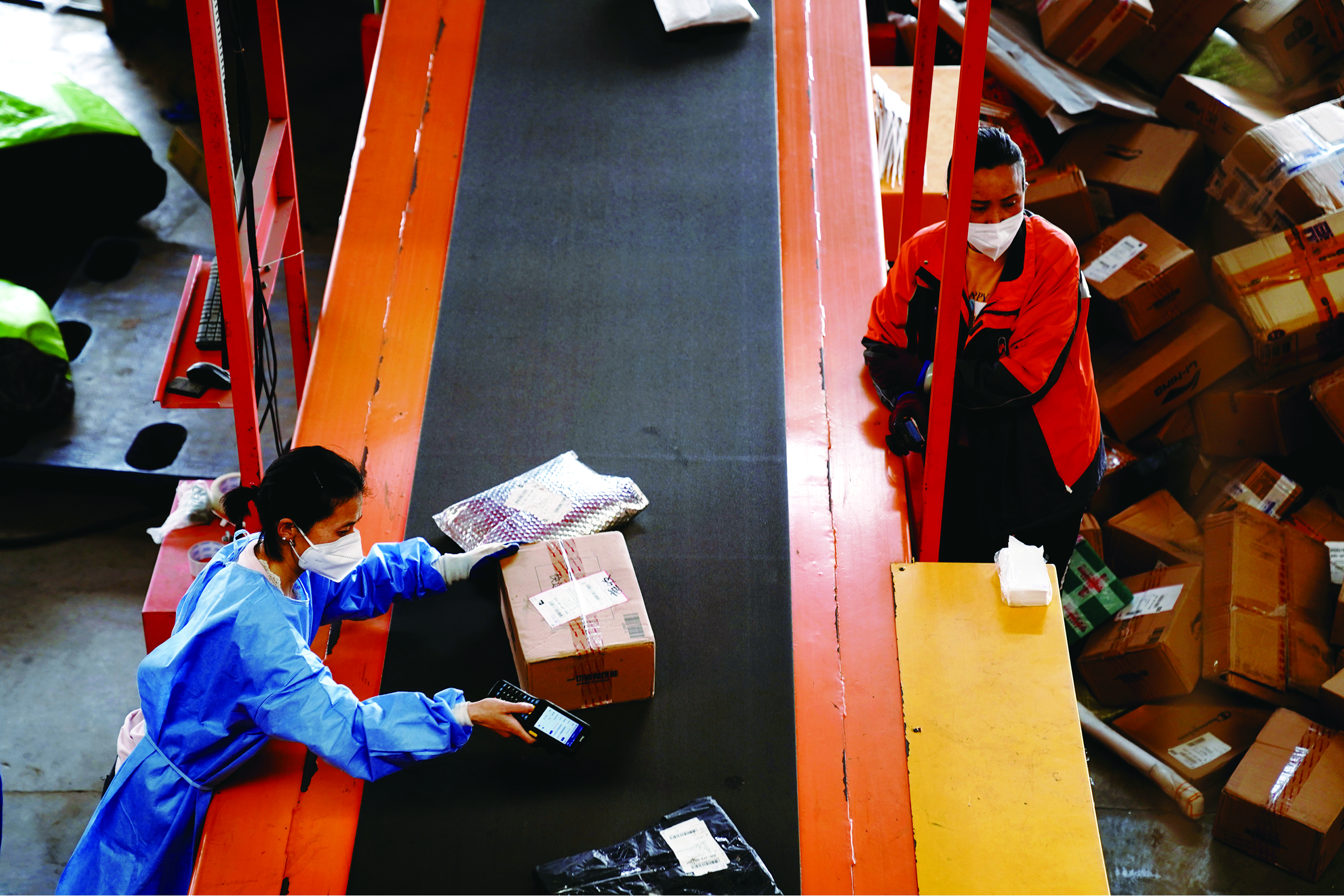 5月9日,复工复产“白名单”企业之一圆通速递浦东集运中心工作人员在流水线上扫描快件。