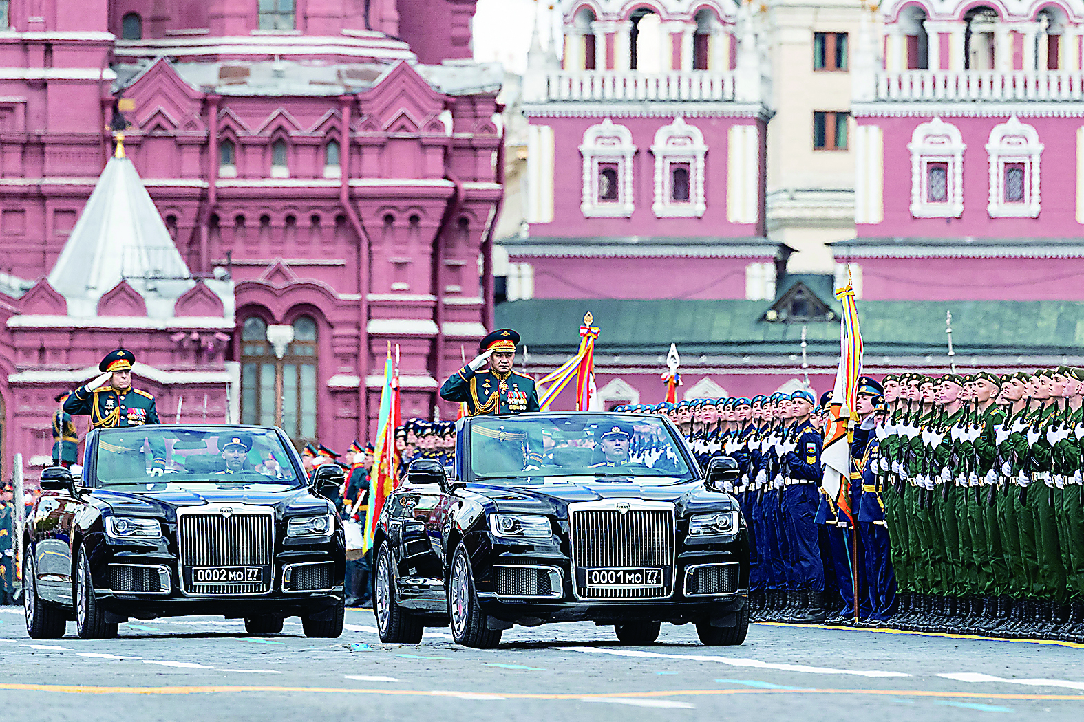 5月9日,在俄罗斯首都莫斯科,俄罗斯国防部长绍伊古(前)与俄联邦武装力量陆军总司令奥列格·萨柳科夫检阅部队。 新华社记者 白雪骐 摄