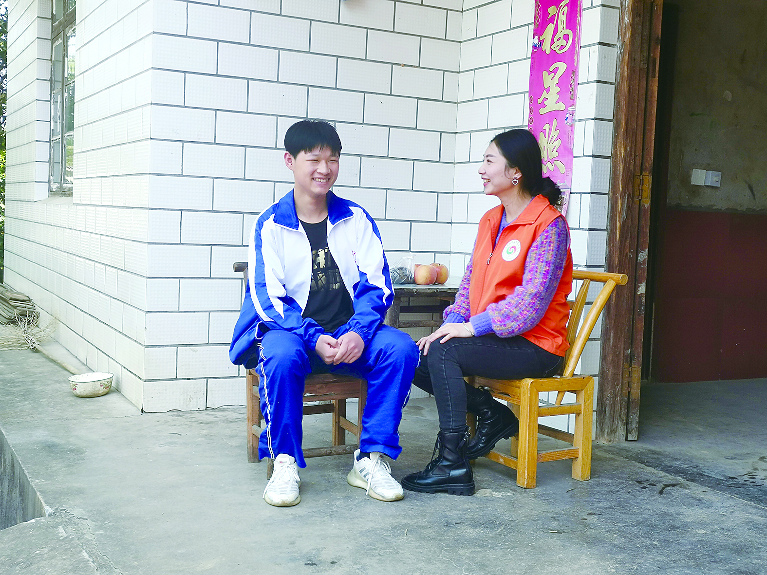 尹琴菲(右)正在与服务对象进行交流。 通讯员 供图