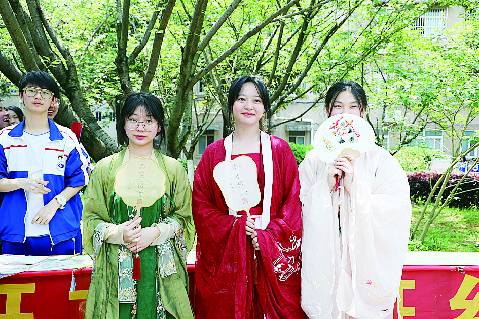 日前,市四中2114班首届班级文化节第一次线下活动在该校春之声音乐广场举行。字迹隽秀的团扇、用书法创作的精美书签、长约三米的瘦金体书法卷轴……2114班三位同学身着汉服为这些作品打call,精美的展品、亮眼的汉服装束营造出了浓厚的传统文化氛围,一时间吸引了大批的同学和老师驻足欣赏。
