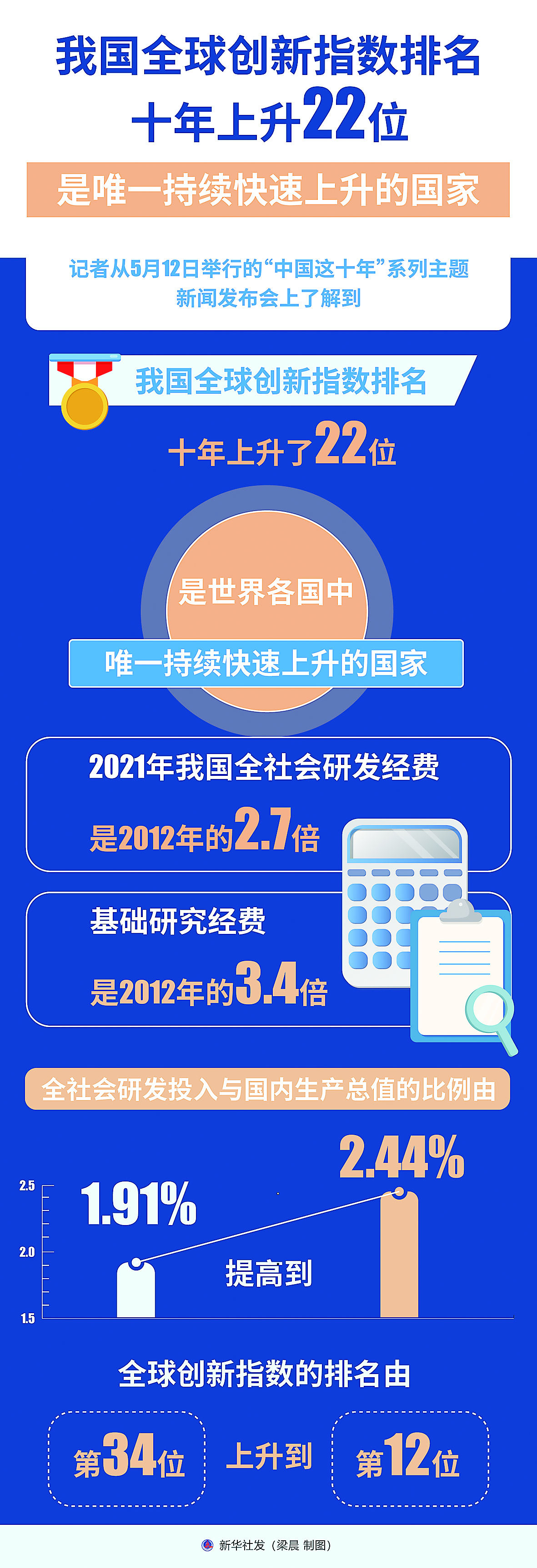 记者从5月12日举行的“中国这十年”系列主题新闻发布会上了解到,2021年我国全社会研发经费是2012年的2.7倍,基础研究经费是2012年的3.4倍。我国全球创新指数排名十年上升了22位,是世界各国中唯一持续快速上升的国家。