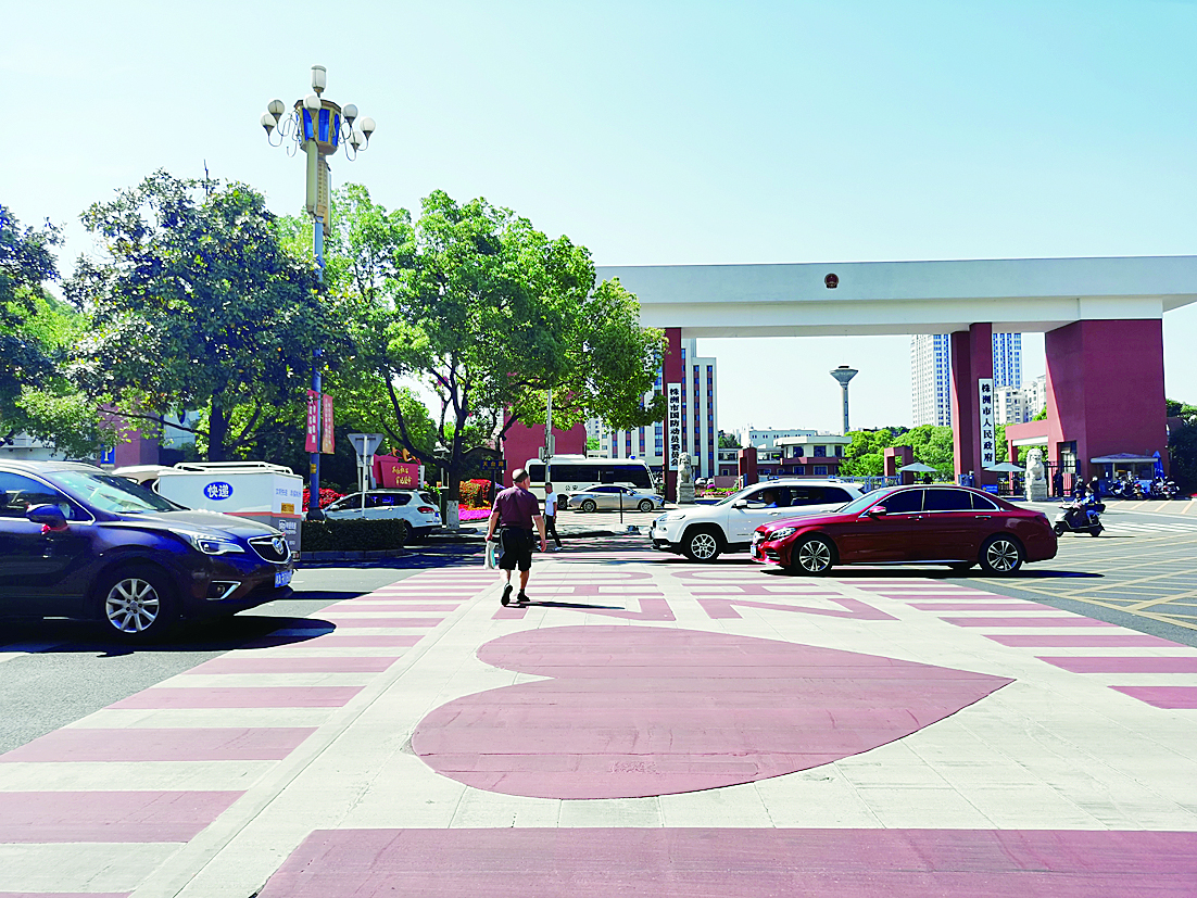 在天台路,不少车辆经过“我爱株洲”彩色斑马线前会减速礼让行人。 株洲日报全媒体记者/刘琼 摄