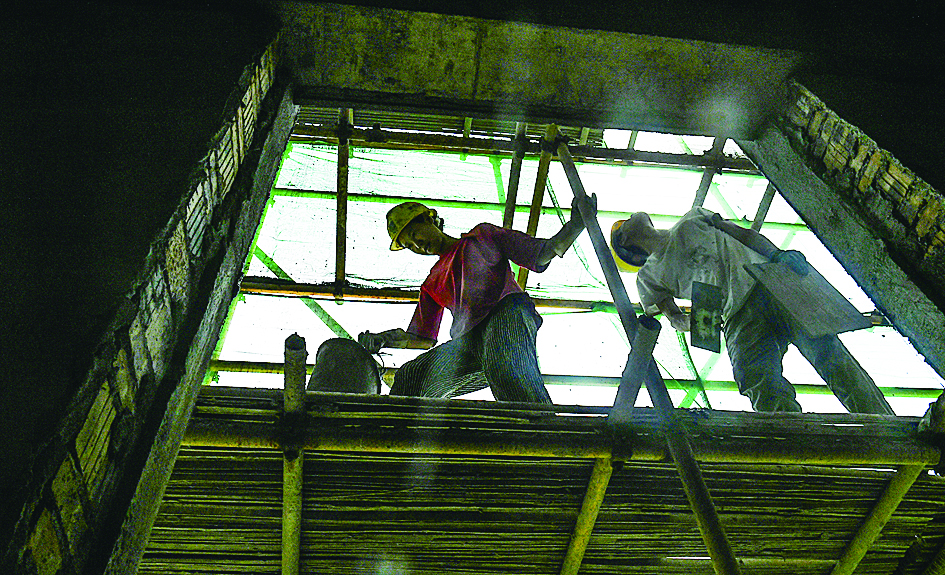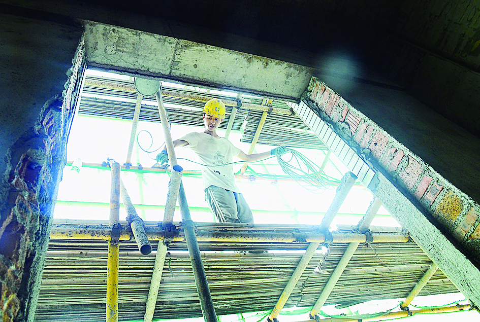 脚手架上,王全辉麻利地把水泥浆抹在墙面上。