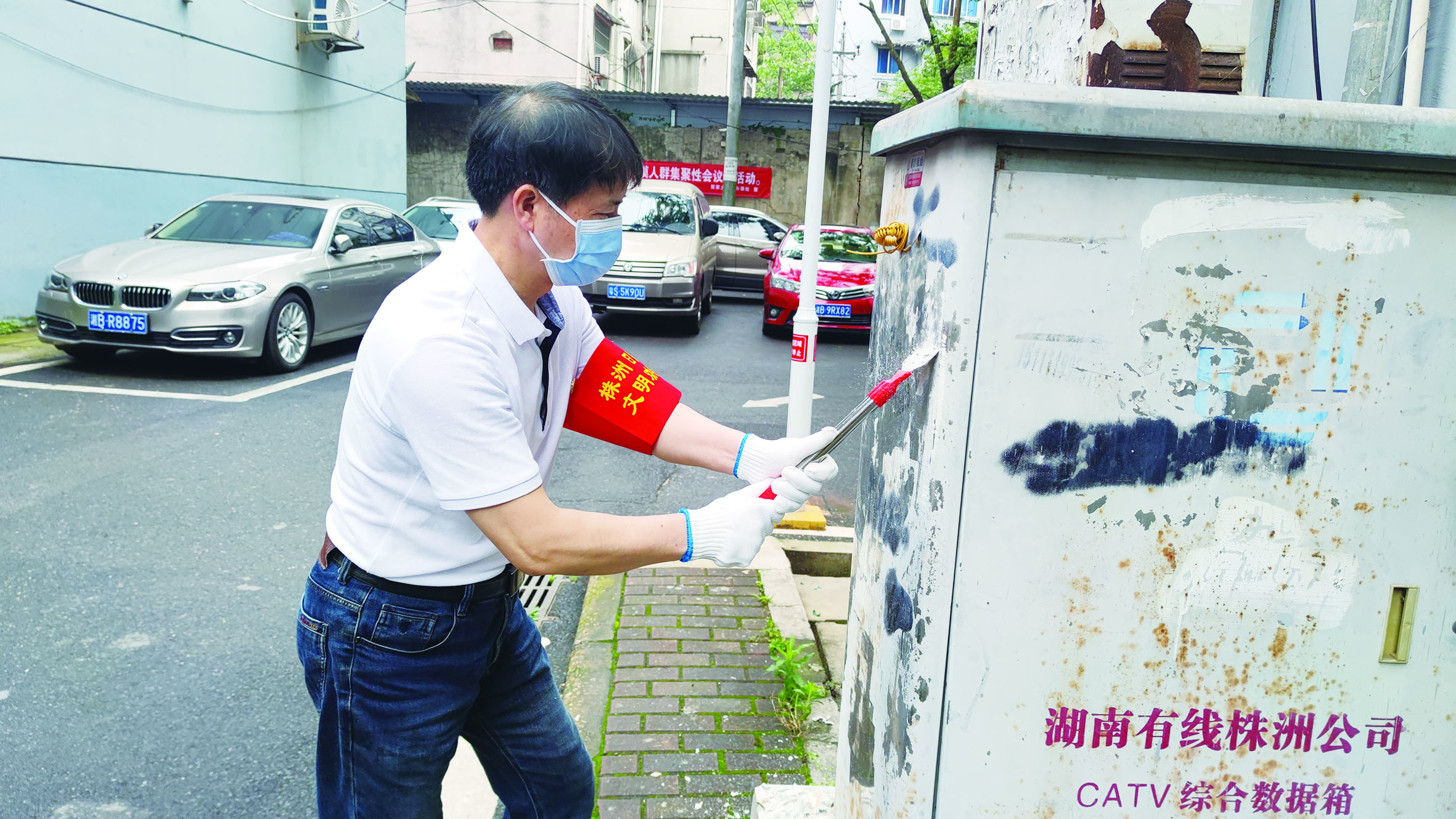 株洲日报社党员志愿者在社区清理“牛皮癣”。 全媒体记者/杨凌凌 摄