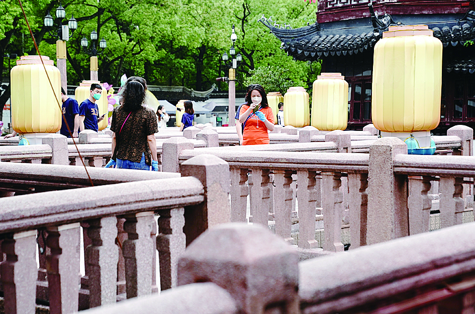 5月28日,市民在上海豫园商城内游玩。 当日,作为上海地标的豫园商城恢复线下营业。目前,豫园商城每日营业时间为上午9点至下午5点,市民须完成线上实名登记预约入园。