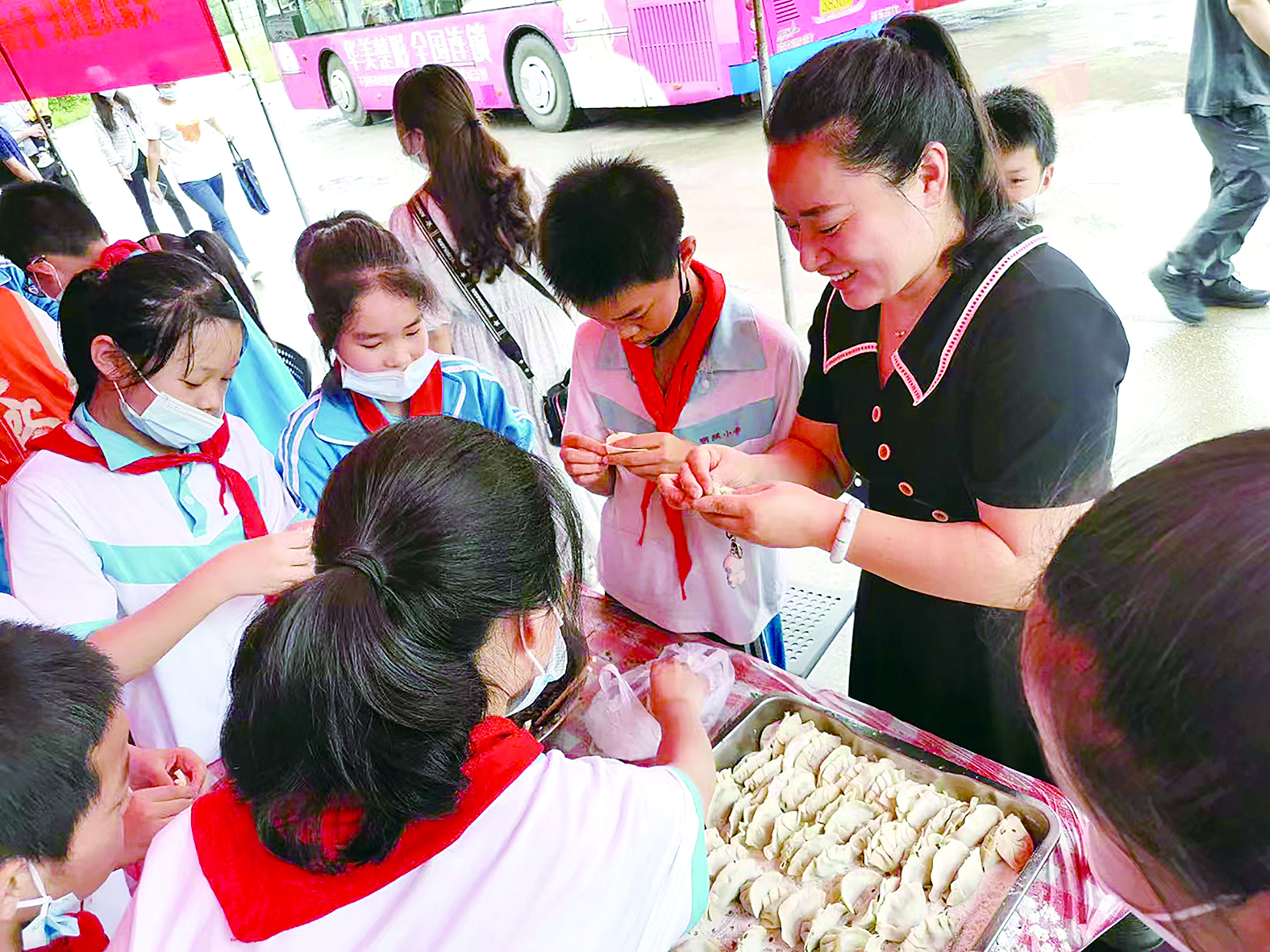 5月30日,“六一”儿童节前夕,明照村联合企业、爱心志愿者举办“关爱儿童成长,童心向党庆六一”主题活动,少先队员代表给党员干部和企业负责人戴上鲜艳的红领巾。现场,比厨艺、包饺子、做游戏……孩子们一片欢声笑语。图为志愿者和孩子们一起包饺子。株洲日报全媒体记者/俞强年 通讯员/张永红 摄